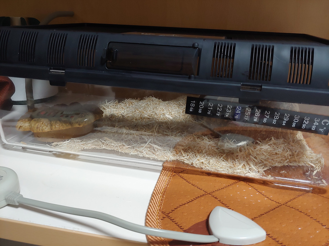 집을 세팅하고 그 안에 넣기까지 한바탕(?)했지만 이름만 뱀이지 어린 개체라 갓난아기 그 자체였다. 반항은커녕 깜짝 놀라다가 후다다닥 필사적으로 이불속으로 들어가 큼큼거리는 모습이.. 역시 동물도 아기 때 겁이 많은 건 사람이랑 별 차이가 없다는 걸 느꼈다. 이불속으로 쏙 들어가 루비처럼 빛나는 눈을 뜨고 은신해 있는 엘리를 엘리 집으로 옮기는데 애를 먹었지만 역시 순둥순둥 했다. 뱀도 개체마다 성격이 다 다르다지만 엘리는 톡 쏘거나 히싱(쉭쉭 거리는 행동)은 전혀 하지 않았다;