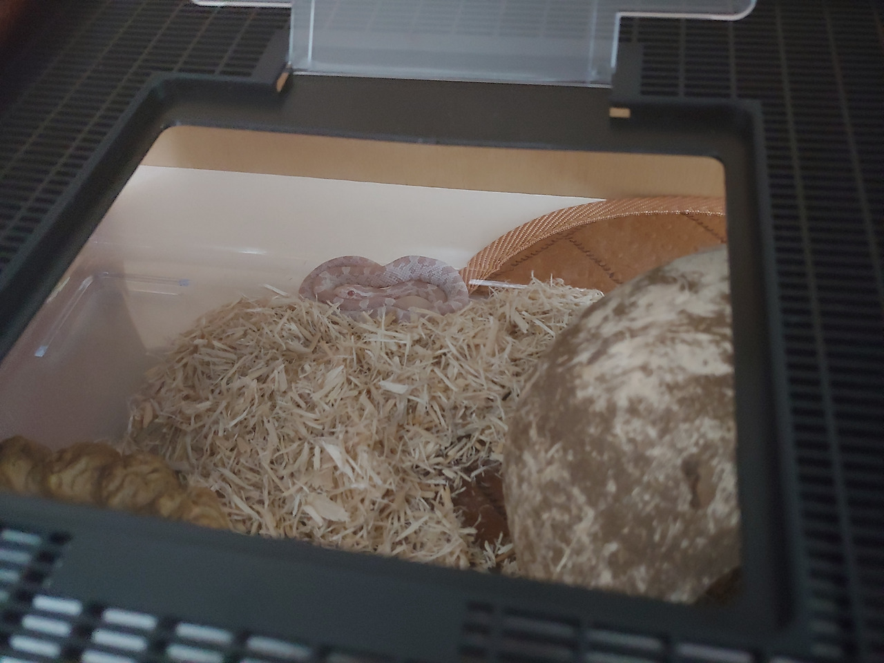 그냥 두어선 어디 틈새나 구멍에 들어가버릴까봐 내심 불안해지기 시작했다. 안되겠다! 하고 조심스럽게 엘리를 옆으로 들어올리니 갑자기 빼애앰!! 하듯 파닥거리며 빛의 속도로 이불더미(?)속으로 들어가버렸다. 어쩜.. 이리 이불을 좋아하는지 아니면 뭔가 구석진것을 좋아하는건지 모르겠다. 근데 뱀 습성상 후자가 맞는듯하다.