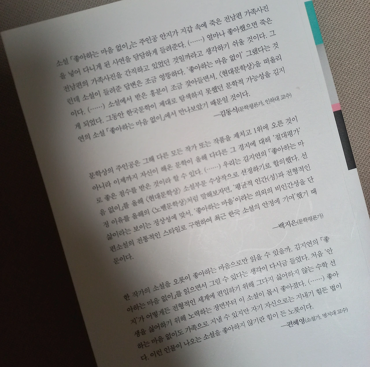 김지연의 <좋아하는 마음 없이>는 <제70회 현대문학상>의 후보작 중 6명의 심사위원이 별 이견 없이 수상작으로 선정했다고 한다. 처음엔 '그 정도인가?' 갸웃거렸다.