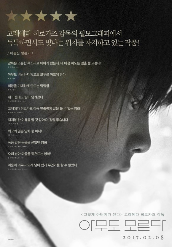 비극적 내용을 극한 분노나 신파 없이 연출된 절제된 감정선을 따라가다 마지막 장면에서 참았던 눈물이 기어이 쏟아지고 말았다. 그리고 <아무도 모른다>의 제목을 생각해 본다.