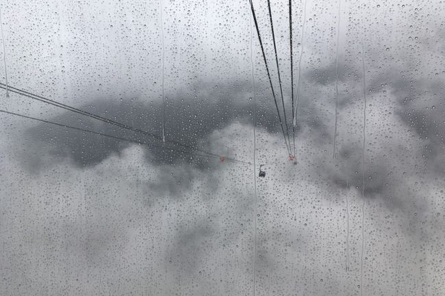 그는 아슬하게 줄에 매달려 양손에 걸레를 들고 창문을 닦고 있다.
