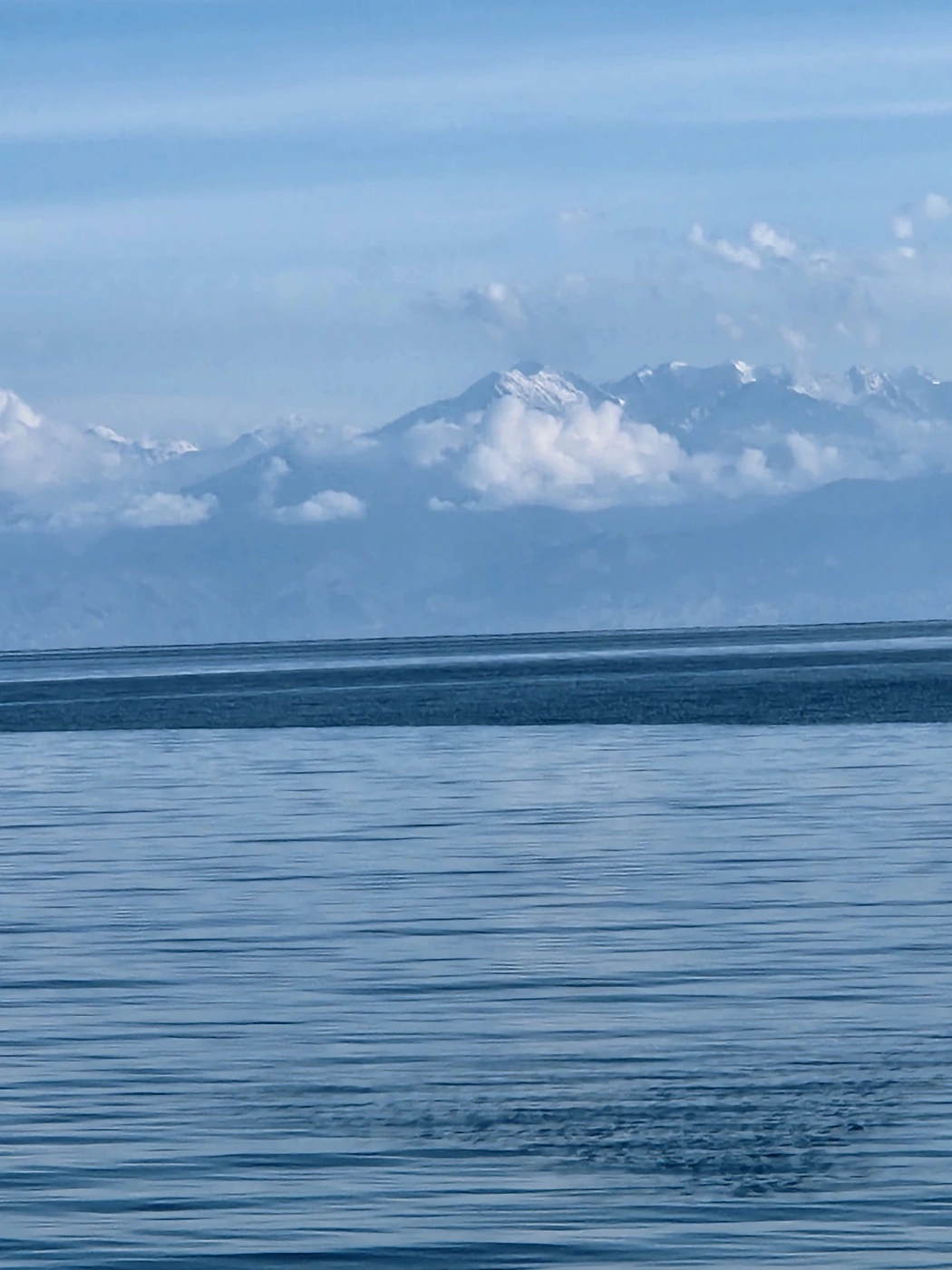 제주도의 4배 크기가 말해주듯 이식쿨호수는 바다다. 호수임에도 불구, 수평선이 바라보인다.세계에서 2번째로 큰 산정호수이다. 호수에서 바라보면 톈산산맥의 만년설이 보인다. 멀리 보이는 산봉우리의 하얀색 부문이 만년설이다. 놀라운 것은 톈산 산맥의 만년설이 녹아서 흘러내린 물로 호수가 이루어졌다는 사실이다.
