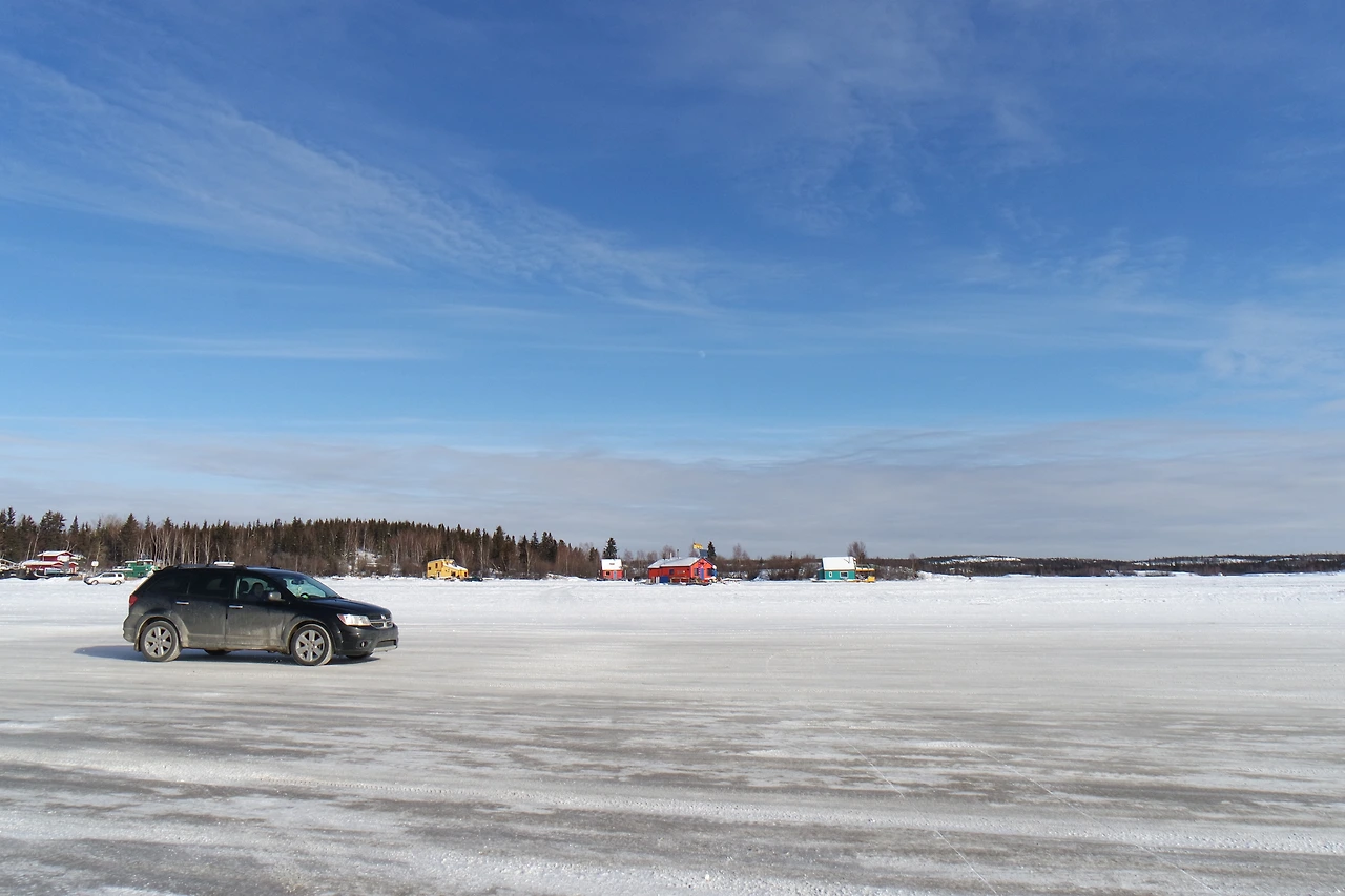 얼어붙은 그레이트 슬레이브 호수를 달리는 자동차
