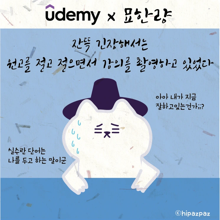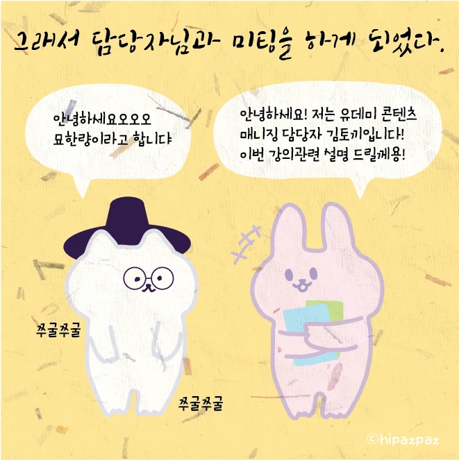이런 고민에서 시작하여 저도 많은 시행착오를 겪으면서 많은 분들께서 공감과 사랑해주시는 묘한량이란 캐릭터가 탄생하게 되었습니다. 이렇게 제가 겪었던 경험을 많은 분들과 공유하고 싶어서 이번 강의를 진행하게 되었습니다. 저와 함께 할 이번 수업 <누구나 쉽게 디지털 드로잉 기초 배워보기>에서는 아이패드를 가지고 무언가를 그리고 싶은데 어떻게 시작을 해야 할지 잘 모르겠다. 그리고 캐릭터를 그려보고 굿즈도 제작해 보고 싶은데 조금 막막하다 하시는 분들을 위한 강의입니다.