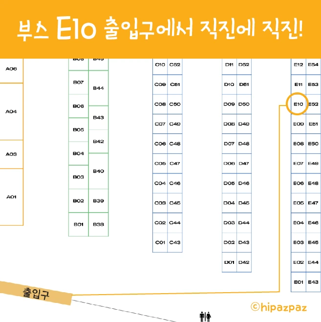 부스 위치는 [E10] 입니다. 출입구 들어오셔서 쉽게 찾으실 수 있습니다.