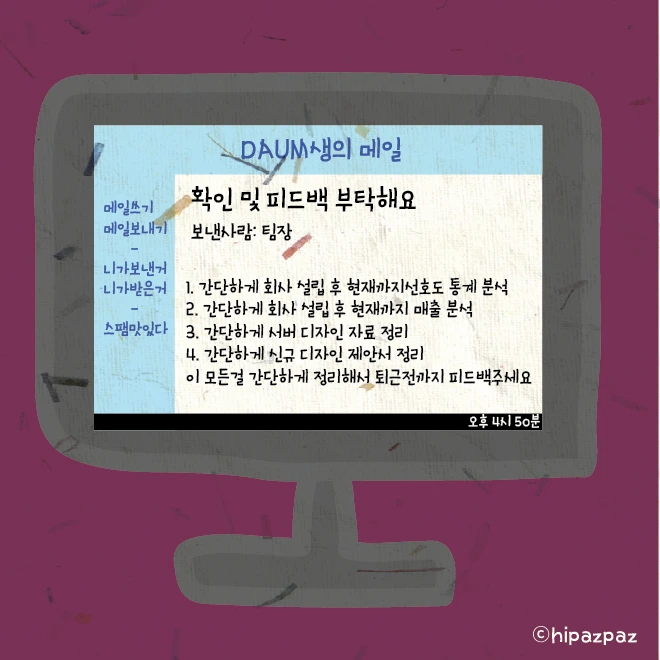 이번 디자인은 누구나 회에서 한 번쯤 겪었을 일입니다. 회사니깐 직장 상사로써 업무를 지시하는 건 당연하지만 그래도 처리할 수 있는 능력 범위 내에서 시키면 좋겠습니다.