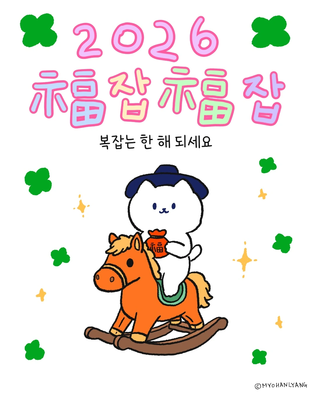 2026 병오년은 붉은말의 해로 붉은말은 매우 강한 활력, 생동감, 그리고 거침없이 질주하는 에너지를 의미합니다. 복잡했던 일 다 잊으시고 새롭게 시작되는 새해 福잡福잡 하셔서 모두 건강하시고 원하시는 소원 다 이루세요!