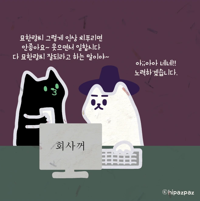 이런 상황에서 "얼굴 펴요"라는 말보다 "웃으면서 일합시다"란 소리를 더 많이 들은 거 같습니다.