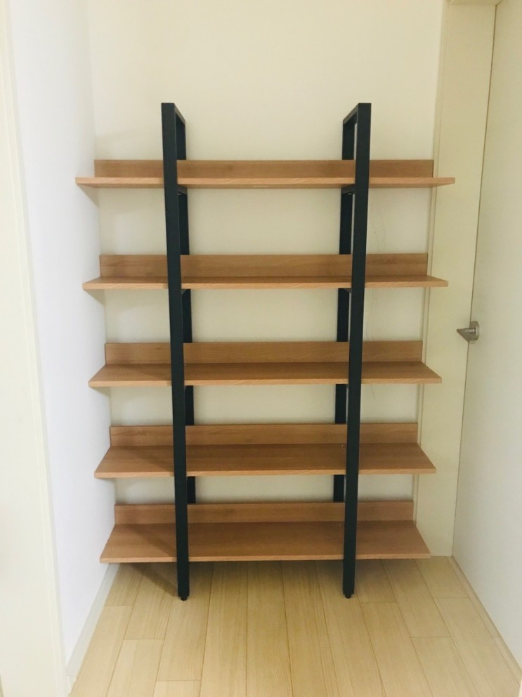 선반의 형태를 띤 책장이라 구입하기 전부터 벽에 고정을 해야 한다는 동의서를 받았다. 앞으로 쓰러질 염려가 있으니 주의라서 벽 고정을 어떻게 해야 하나 싶었는데, 선반과 벽 사이즈가 정말 꼭 맞았다. 덕분에 벽에 고정을 할 필요도 없이 선반이 스스로 고정 역할까지 해서 마음에 들었다.