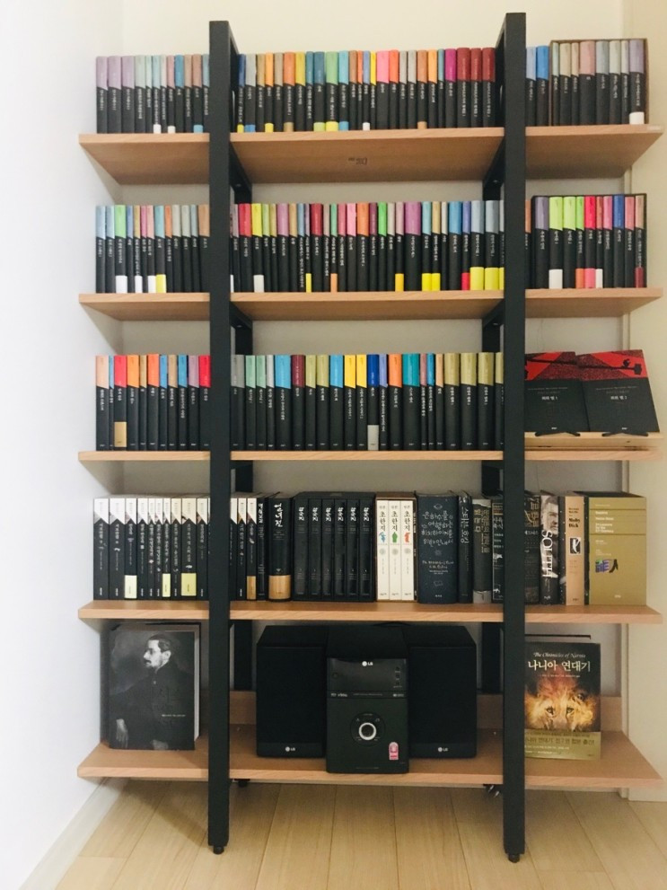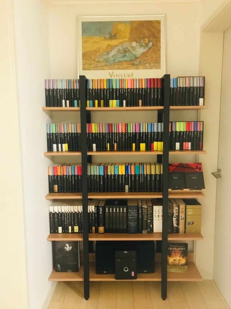 딱 하나의 단점은 깔끔하게 정리를 한 탓에 책이 바로 뽑아져 봐지진 않는다는 점이다. 서재방에 이미 읽어야 할 책들이 순서대로 기다리고 있고, 이 책장은 전시용에 가깝기도 하고, 좀 과장하자면 마음에 지각변동(?)이 생길 때 읽어야 할 책들이 대부분이긴 하다. 그럼에도 같은 시리즈의 책을 한 곳으로 모았다는 후련함과 자주 보게되는 책장이 예쁘다는 사실이 나를 즐겁게 해준다.
