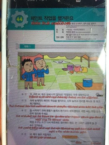 한국에 가서 일하고 싶어서 공부했대. 지금 시험까지 통과한 상태고 한국에 있는 사장님들이 뽑아주면 내년쯤에는 가서 4년 정도 일할 수 있을 거래. 그럼 돈을 많이 벌어 올 수 있대. 공장, 낚시, 건축이었나.. 아무튼 세 군데 중 한 곳에서 일할 수 있는데 다치거나 죽는 사람도 가끔 있대. 그래도 뭐, 괜찮대. 친구들 중에 한국에 가 있는 사람이 몇 있는데 차도 끌고 다니고 아주 잘 지내는 것처럼 보인대. 나한테 한국어 교과서도 보여줬어. 어떤 내용이었냐면 늦게까지 페인트 작업하느라 정리를 못해서 작업장이 엉망이고 냄새난다고, 그러니 얼른얼른 치우고 앞으로 작업도구는 쓰고 나서 바로 치우라는 내용이었어. 근데 나, 마음이 괜히 이상한 거 있지? 일할 때 꼭 필요한 단어, 어휘 들일 텐데. 내가 배우던 외국어 교과서들과는 좀 달라서 그랬나 봐. 아무튼 그랬어. 그 친구들 한국 오면 내가 비빔밥 쏘기로 했다! :D