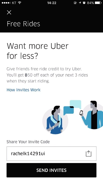 만약 본인의 추천인 코드를 타인이 가입 시 입력하면, 그 가입자의 첫 탑승 시 본인도 50 baht 무료 이용권 세 장을 받는다. 추천을 한 사람과 받은 사람 모두 무료 이용권을 받을 수 있는 것이다. (주의: 코드로 가입한 사람은 가입 즉시 무료 이용권 수령/코드를 준 사람은 새로운 가입자의 첫 탑승 시 무료 이용권 수령 가능)