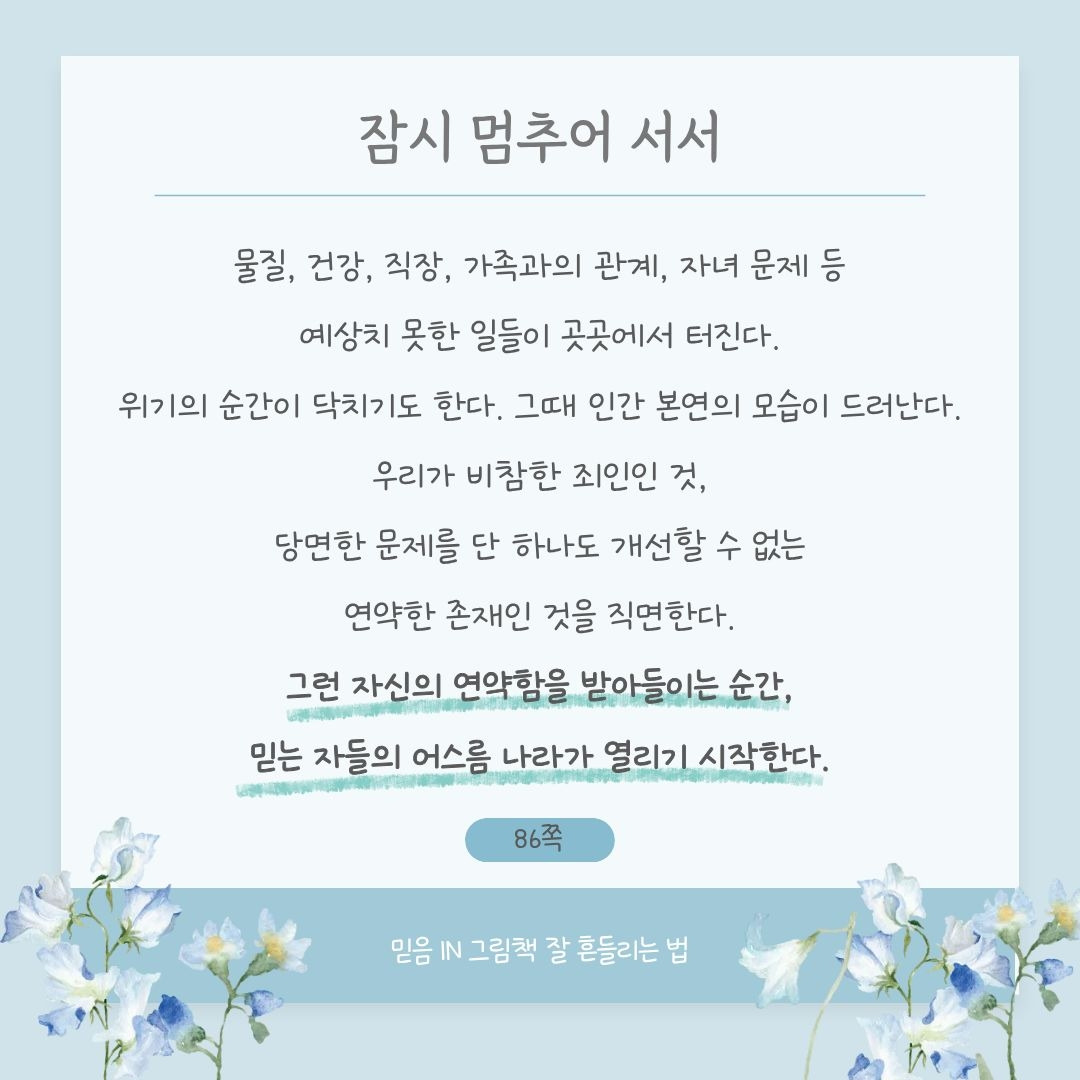 나의 고민을 들은 동생이 “언니, 언니는 주님에 대한 얘기를 쓰면 어때요?” 란 말을 건넸다. 그렇지, 나를 일으켜 세워주었던 믿음에 대한 서평을 써야지! 그건 너무 쓰고 싶은 이야기지! 글쓰기의 방향은 또렷해졌고, 오래 걸리지 않아 책의 제목도 떠올랐다.