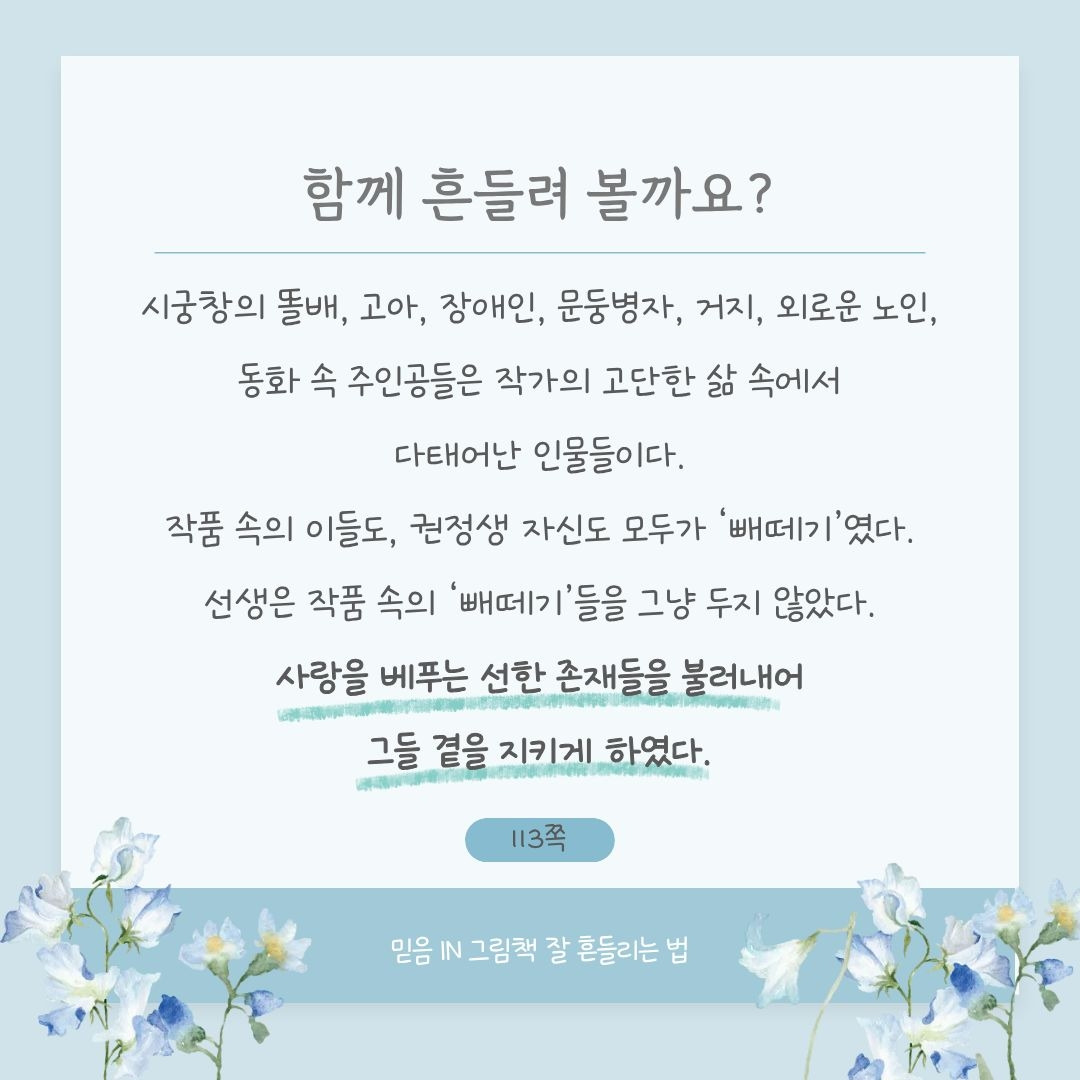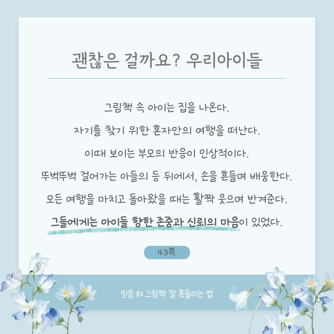 매주 한 번씩 온라인에서 만나 그림책을 읽고 피어나는 생각과 느낌들을 나누고, 한 편의 글로 써내는 것은 나를 알아가고 타인을 이해하는 시간이었고, 삶을 보다 나답고 의미 있게 가꾸는 좋은 기회가 되었다.