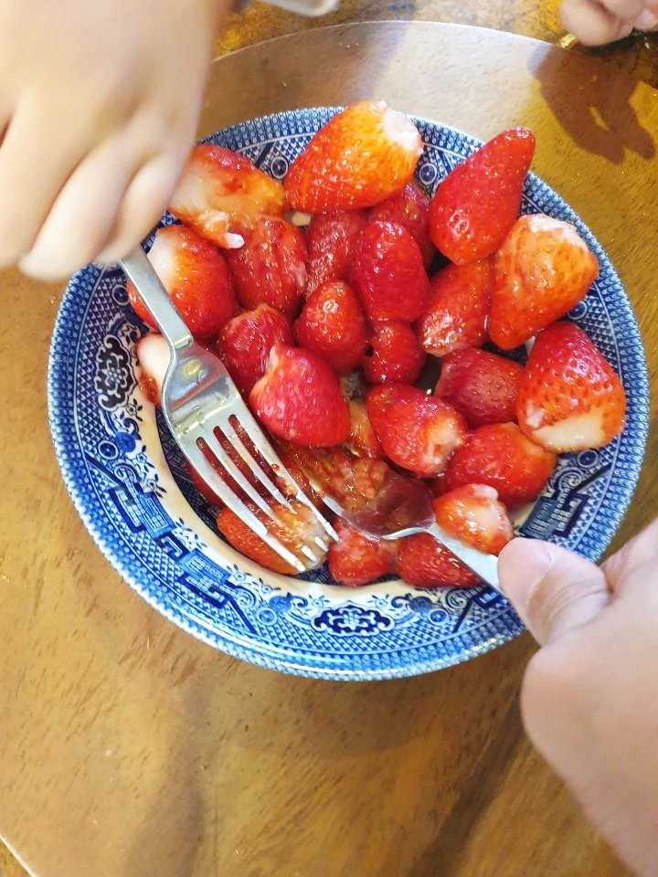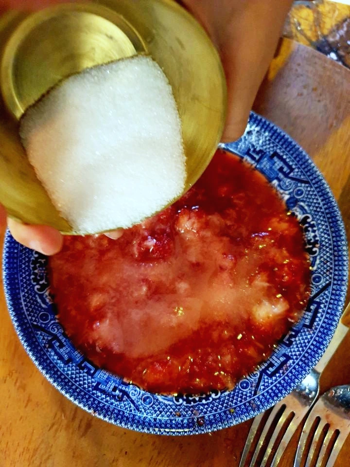 먼저 딸기 꼭지를 손질한다. 큰 그릇에 적당량의 딸기를 담는다. 그리고 포크로 눌러 으깬다. 양을 가늠하기 어려우면 딸기를 컵에 담아본다. 딸기 사이의 빈틈은 다 사라지고 조금 눌려질 것을 상상하면 적당하다.