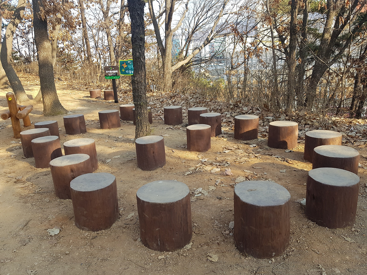 산책 길 나무 의자. 의자들이 이야기를 하는 듯