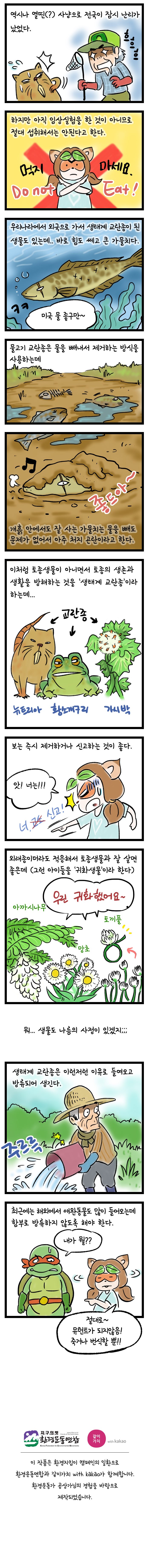 이런 아름다운 생태계가 쓰레기나 사람들의 훼손, 잘못된 방사 등으로 망가지는 일은 너무 슬픈 일입니다. 잘못된 일에는 외래생물의 무단 방사도 한 몫 합니다. 근 십여년 사이에 우리나라도 황소개구리와 뉴트리아 때문에 시끄러웠지요. 수입종은 돈이 안된다고 버리고, 애완종은 키우기 싫다고 버리고... 다른 나라가 아닌 대한민국에서 일어난, 우리와 같은 말을 쓰고 같은 땅에 살고 같은 공기와 음식을 먹는 사람들 사이에서 일어나는 일입니다.
