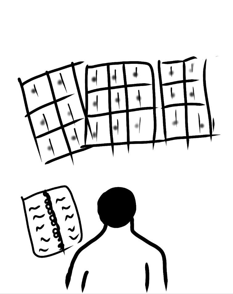 잠시 후, 그의 시선이 이쪽을 향한다. 말이 멈추고 체념의 시선이 한동안 지속된다. 그의 눈빛을 더 이상 볼 수가 없어 고개를 숙인다. 책상이 보인다. 책상 위에 무언가를 쓰고 싶어 진다. 옆에 놓인 볼펜을 붙잡고 그 끝머리로 사선을 하나 그려본다. 불안함이 조금 사라진다. 더 깊게 사선과 사선 사이에 흔적을 남겨 본다. 잠시 공백이 흐르고 그의 눈빛이 허공에 맴돈다. 손에 더욱더 힘이 가 볼펜을 굳게 잡고 책상에 동그라미를 그려본다. 하나, 둘, 그가 다시 수업을 진행한다. 다행이다.