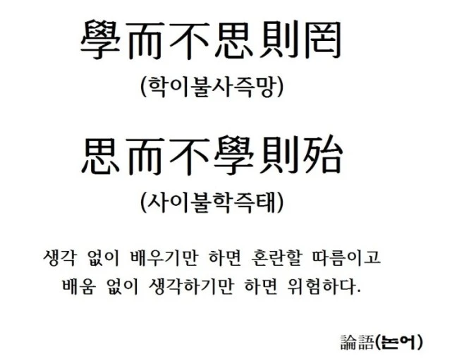 “배우기만 하고 생각하는 것이 없으면 사물의 이치에 어두울 수 있고, 생각하기만 하고 배우지 않으면 위태롭다.” - 위정爲政 2.15