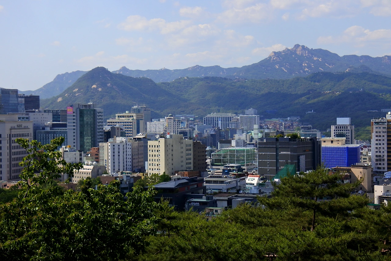 * 남산에서 바라본 서울 중심부: 가까이는 북악산이 보이고, 멀리는 북한산이 보인다.