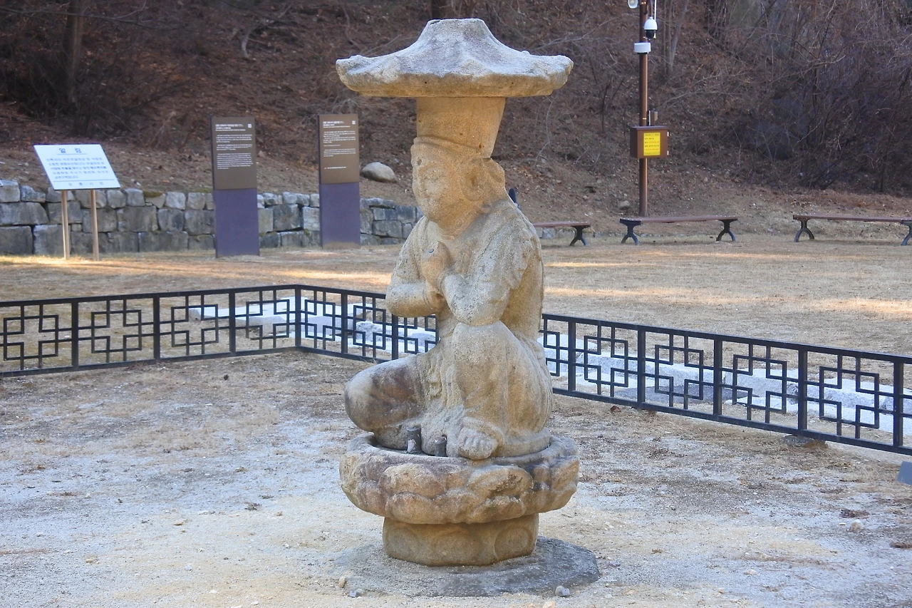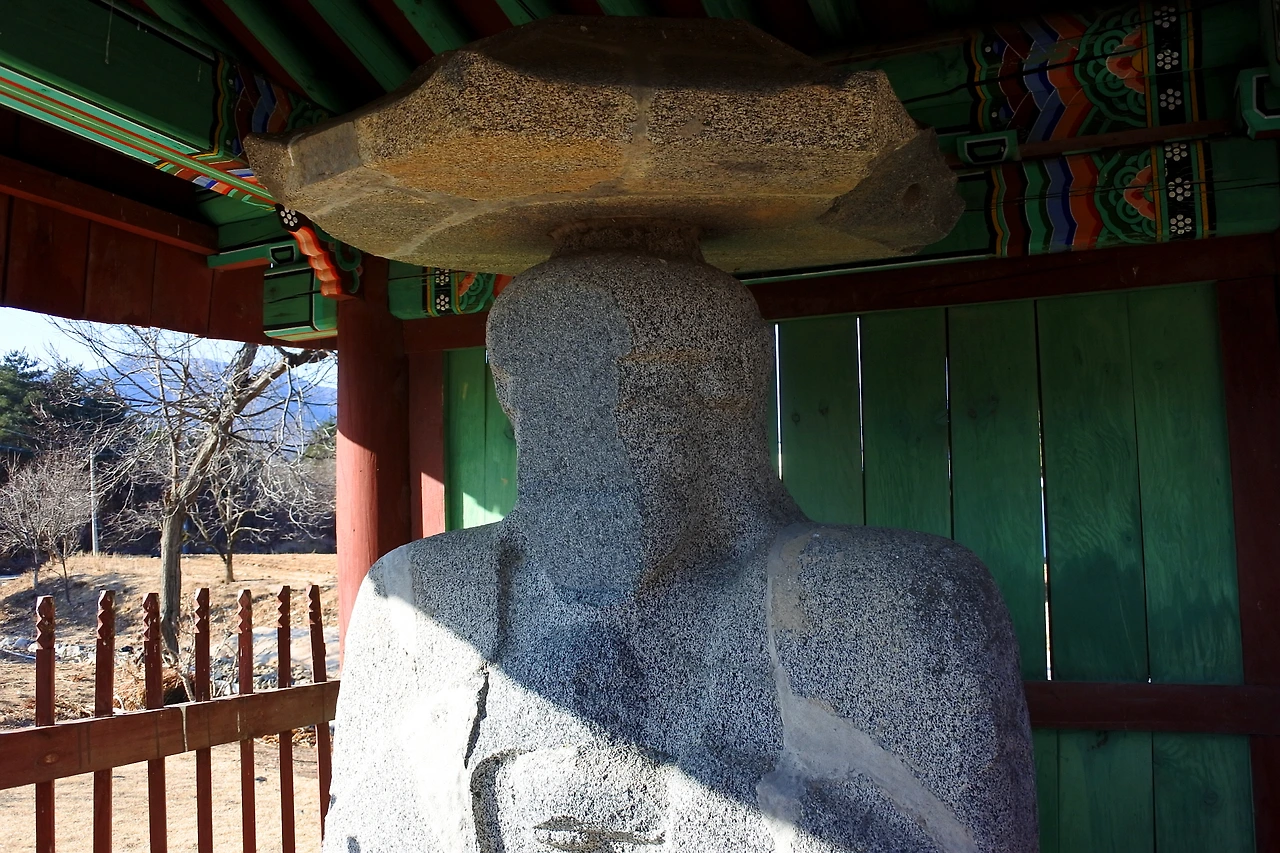당간지주에서 조금만 걸어가면 굴산사지 석불좌상을 만날 수 있다. 보호각 안에 있는 석불좌상은 너무 많이 훼손되어 그 형체를 알아볼 수가 없었다. 화강암으로 만들었으면 저렇게까지 심하게 손상되지 않았을텐데... 혹시 누가 일부러 훼손한 것은 아닌지 의심이 들 정도였다. 실제로 얼굴 부분은 자연훼손이라고 할 수 없을 정도로 예리한 절단면이 보였다.