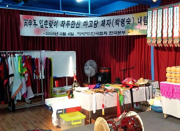 박영숙씨의 내림굿은 2월 4일부터 5일까지, 이틀에 걸쳐 경남 거창군 고제면에 위치한 '아시아1인극협회 한국본부'에서 행해졌습니다. 연극제가 열렸던 소극장에 제단이 차려지고 굿이 거행된 것입니다. 악사가 동원되기는 하지만 굿도 1인극이라고 할 수 있습니다. 그런 의미로 1인극제가 개최된 장소에서 굿이 거행되는 것이 어색해보이지 않습니다.
