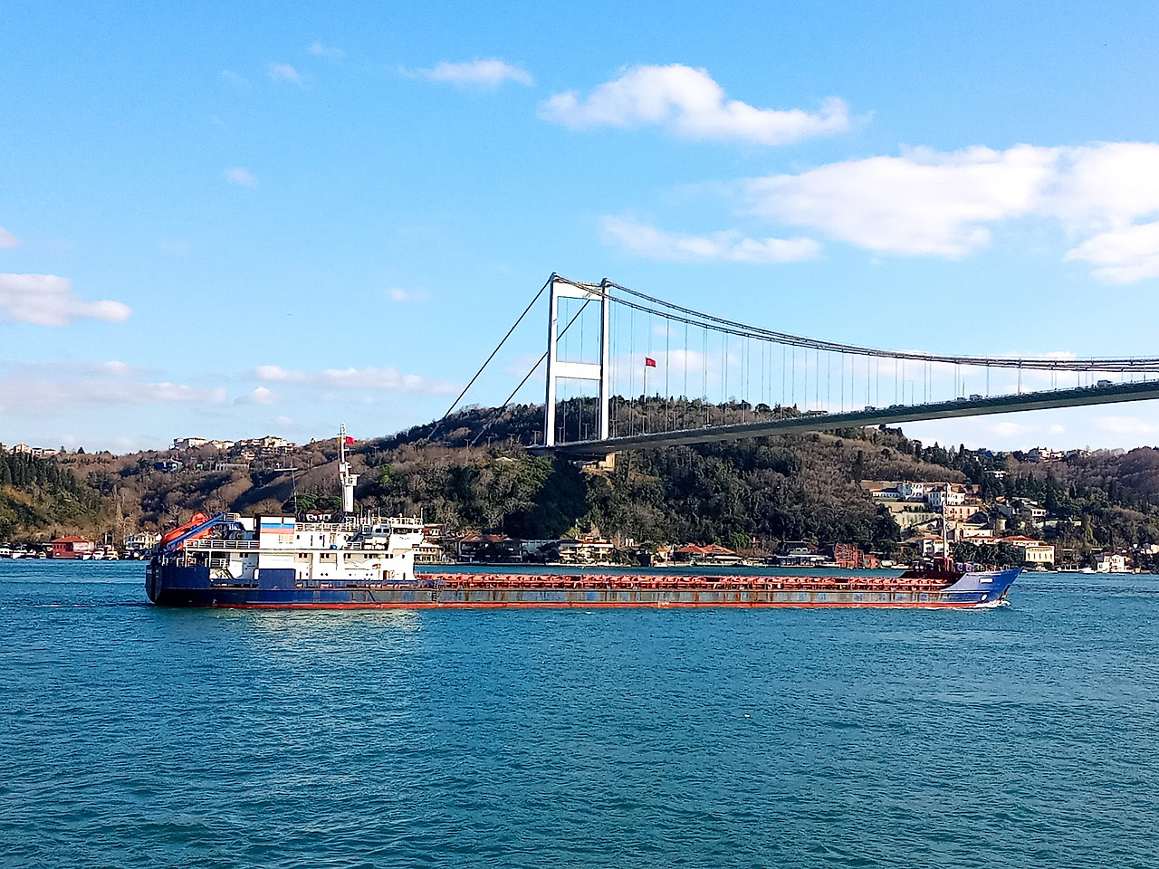 * 보스포루스 해협: 보스포루스 해협을 건너는 러시아 국기를 단 화물선. 보스포루스 해협에서 북쪽으로 올라가면 러시아가 우크라이나에서 빼앗은 크림반도가 있다.