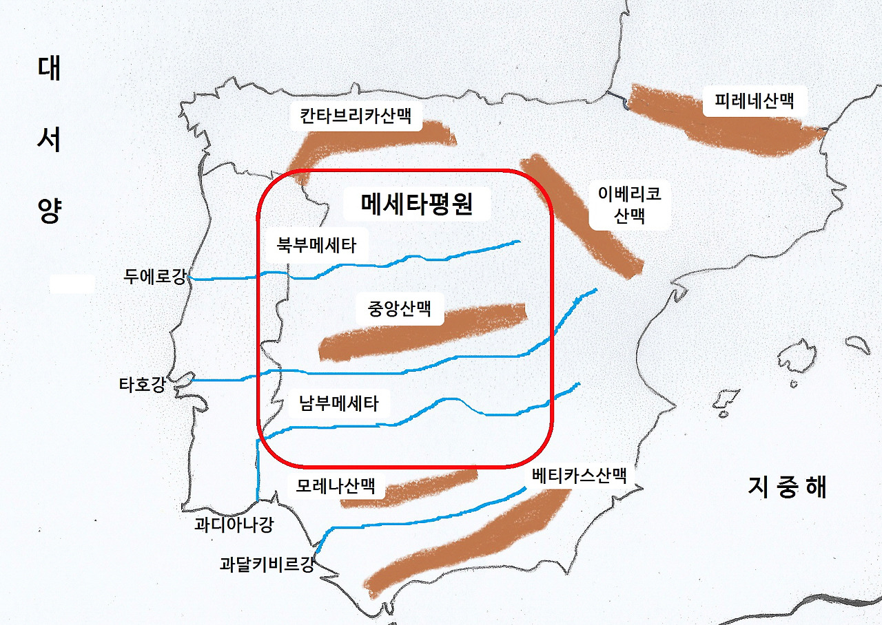 * 지도: 메세타평원을 타나냄. 메세타는 표시된 지역보다 더 넓음. 박스처리로 대략적인 위치를 표시했음.