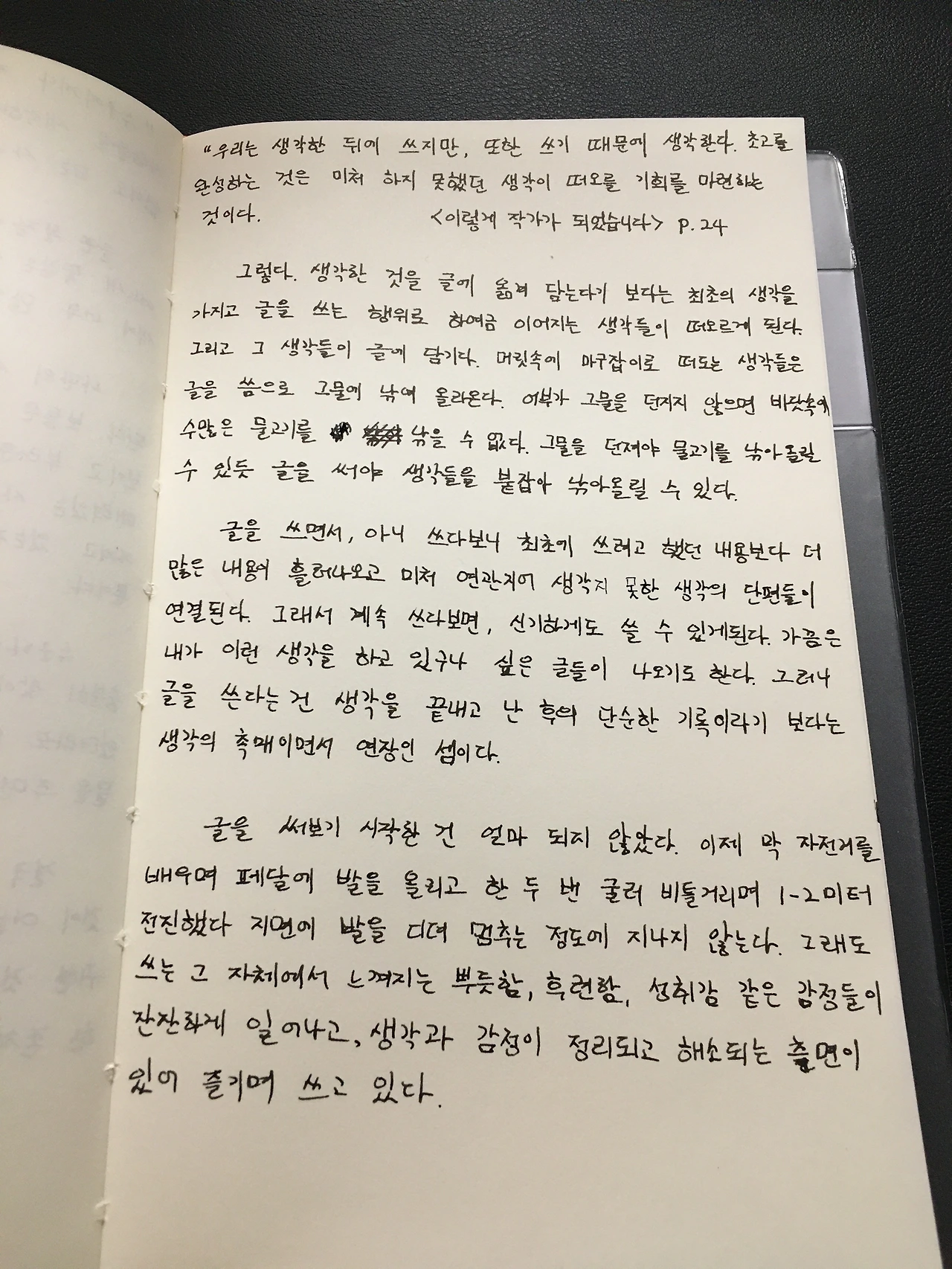 “우리는 생각한 뒤에 쓰지만, 또한 쓰기 때문에 생각한다. 초고를 완성하는 것은 미처 하지 못했던 생각이 떠오를 기회를 마련하는 것이다.“ <이렇게 작가가 되었습니다> p.24