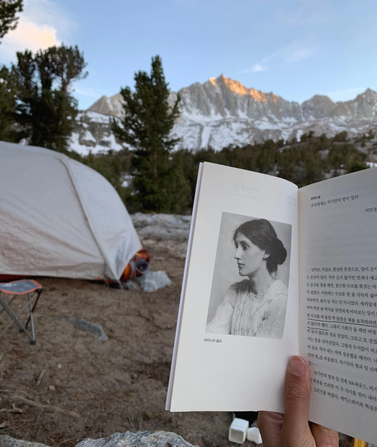 짐을 쌀 때 얇은 책을 하나 챙겨가겠다고 집은 책이 하필 버지니아 울프의 <자기만의 방>이었다. 눈 덮인 산과 차갑게 시린 파란색 호수가 한눈에 들어오는, 햇살에 달궈져 따뜻한 바위에 누워 책을 읽기 시작했다.