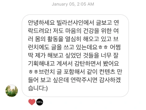 그러니까 (나보다 에너지 지수가 높은) J와의 만남은 이렇게 시작됐다. 멤버로 가입되어 있는 빌라선샤인(일과 삶을 스스로 기획하는 여성들의 커뮤니티) 온라인 공간에 나의 사이드 프로젝트인 WBC를 소개하는 글을 올렸고, 그 글을 본 J가 WBC 인스타로 DM을 보내왔다.