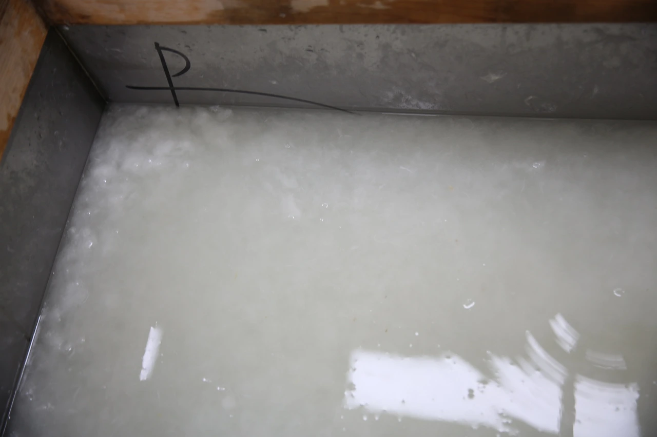 잘 풀린 한지의 재료를 살포시 얇게 한 장을 뜬다.
