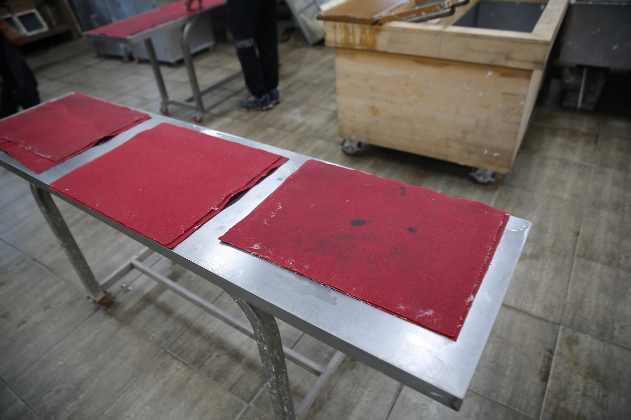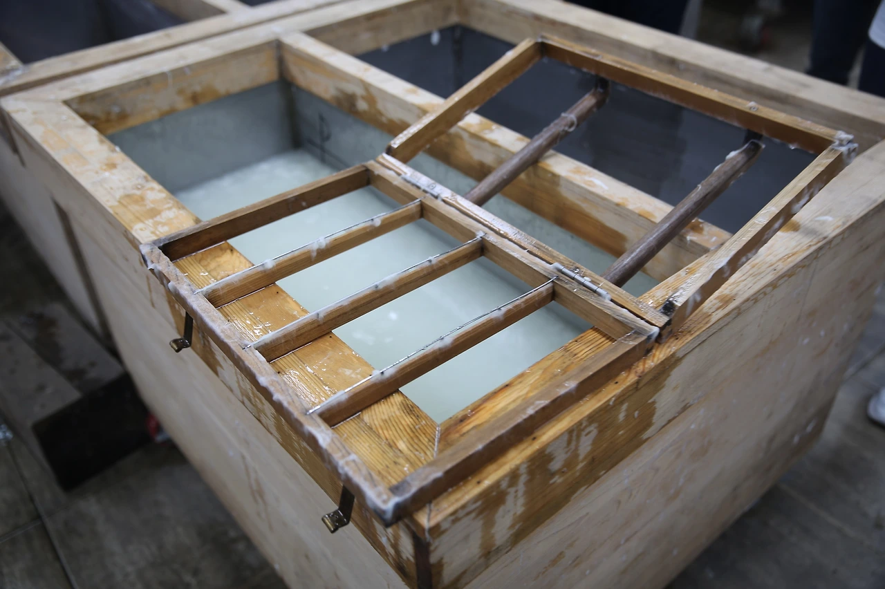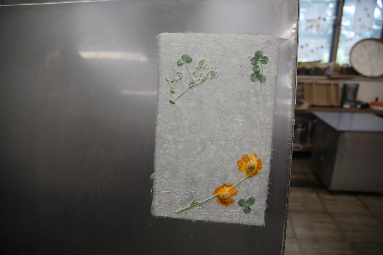 다시 발을 넣어서 위에 덮을 한지를 만들어야 한다. 종이는 판 위에 놓고 돌로 눌러 물을 뺀 다음 나무판에 붙여 건조하기도 한다