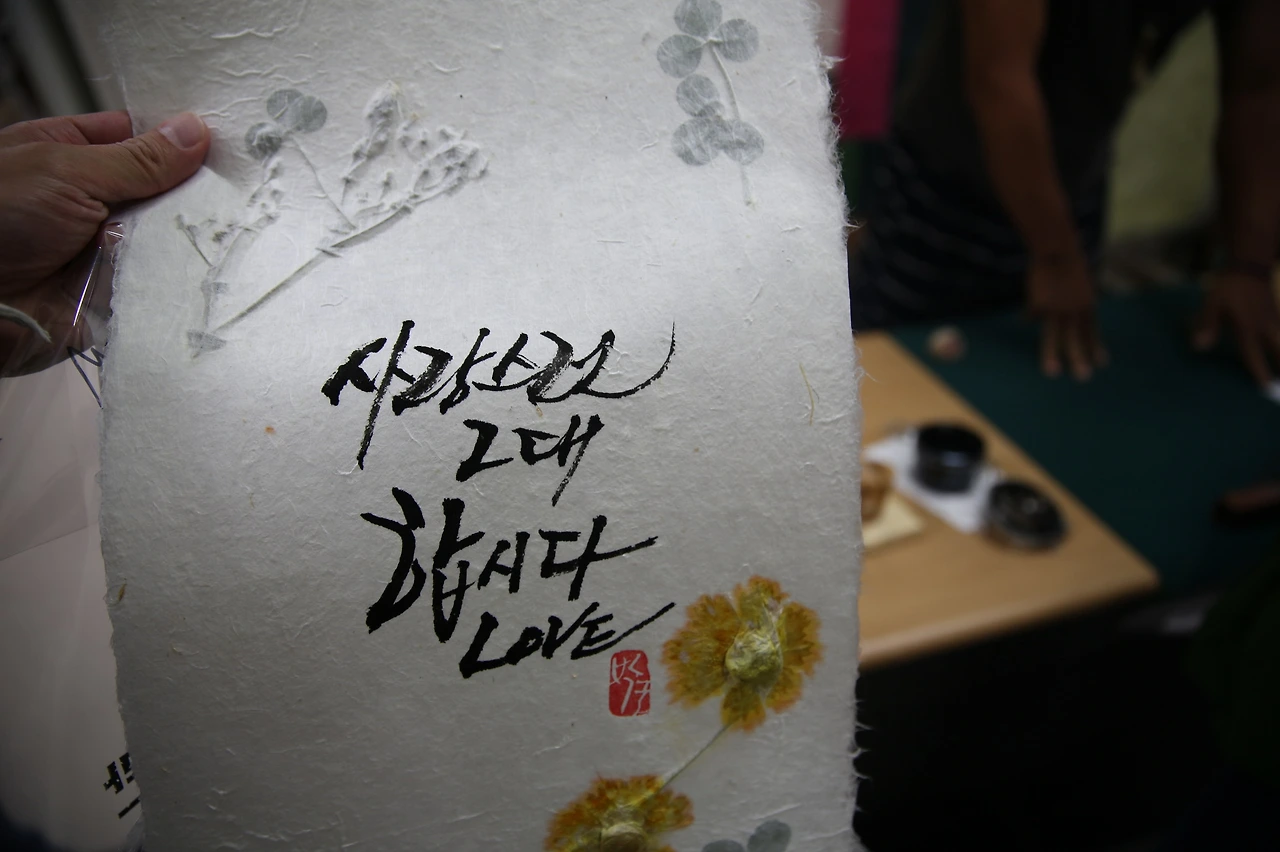 중국에서도 진기하다고 생각했던 한지로 글을 써보기로 한다. 고려의 종이는 누에고치의 솜으로 만들어 색의 희기가 능과 같고 단단하고 질기기가 비단과 같았다고 하는데 여기에 글씨를 쓰면 먹빛이 아름다웠다고 한다. 한지 한 장을 위에다가 깔고 생화를 주변에 잘 배치한다.
