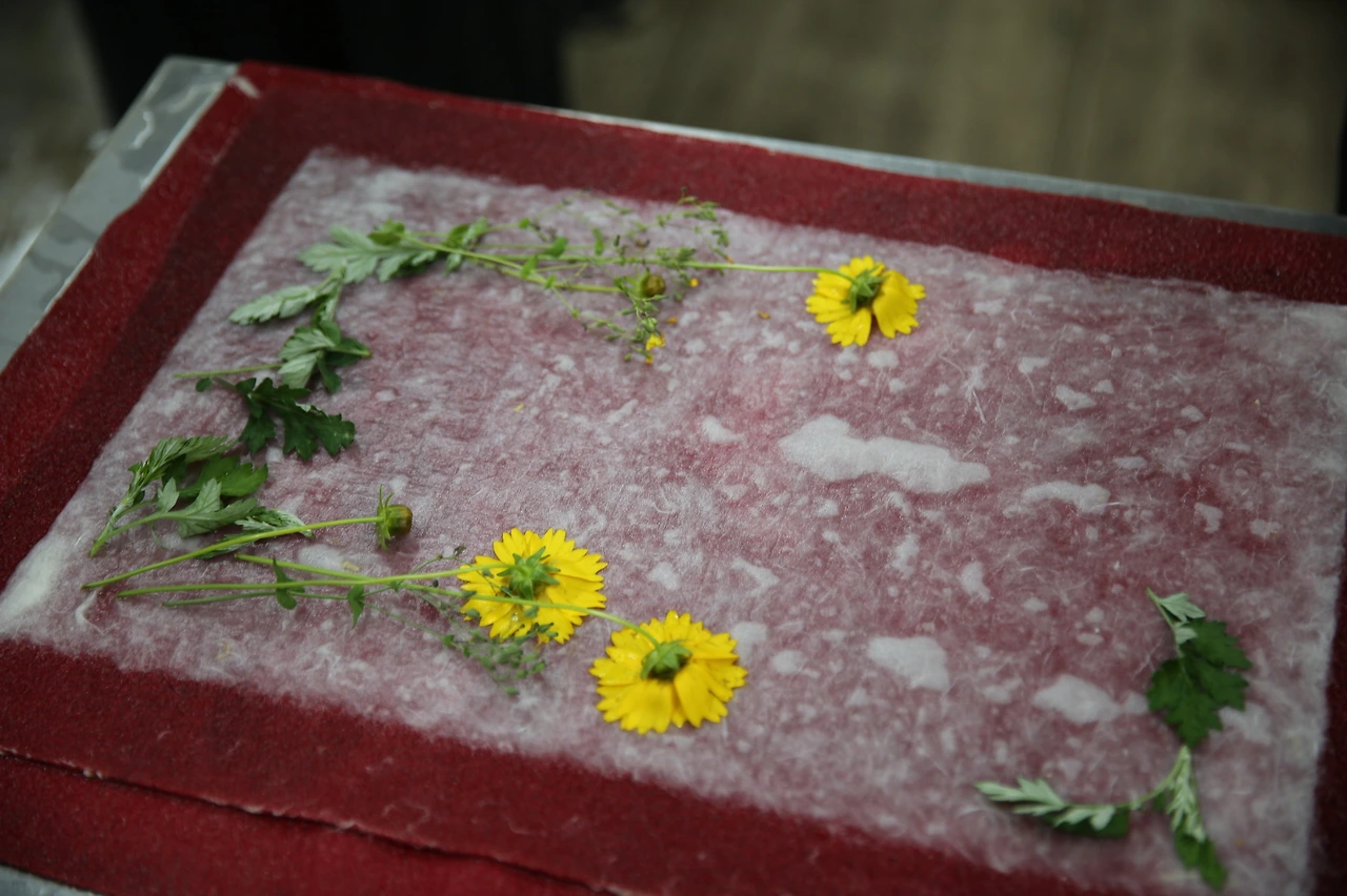물에 잘 풀어놓은 한지를 가지고 무언가를 만들어보기로 했다. 집에다가 걸어놓을 액자와 비슷한 것을 만들기로 했다. 우선 대나무로 만든 발로 얇게 뜬다.