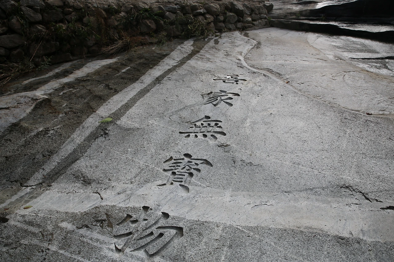 당시에 새겨놓은 것은 아닌 것으로 보이는 글이 바위에 새겨져 있다. 오가부모물(吾家無寶物)이라는 이 한자의 의미는 우리집에 보물이 없다는 의미다. 원래 모든 보물은 몸에 지니고 태어난다고 한다. 그 보물을 찾지 못하니 외부에서 찾는 것이고 탐욕이 심해지는 것이다. 가을의 선율 하나만 가지고 있어도 행복하다면 이미 보물을 가지고 있는 것이다.