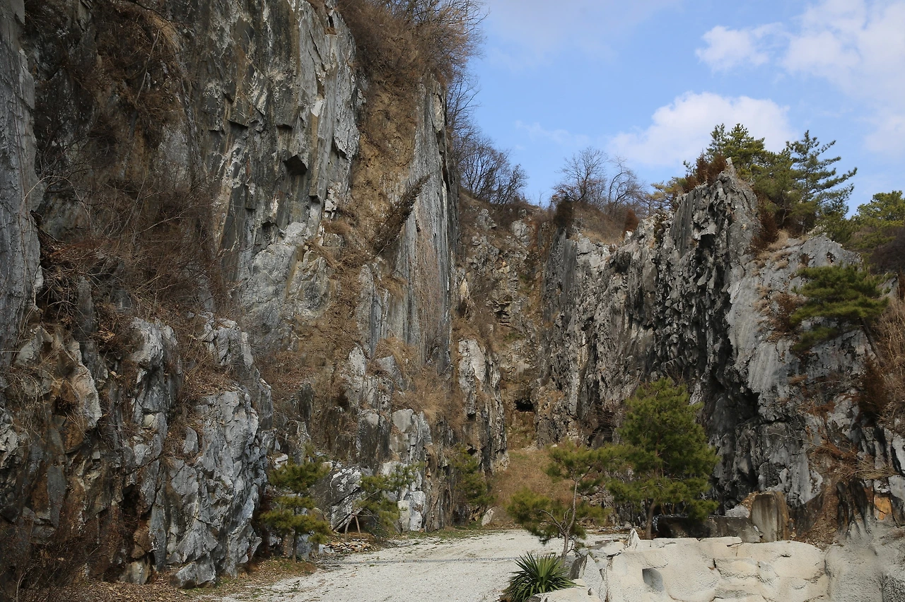바위산과 같은 곳에 푸르름을 보여주고 있는 것은 소나무뿐이다. 저 안쪽으로 걸어서 들어가면 마치 영화 속의 주인공처럼 탐험하러 가는 느낌이 든다. 광산으로 사용되었던 곳이기에 깊숙하게 들어가는 것은 위험하기에 좀 더 멀찍이서 바라만 본다.