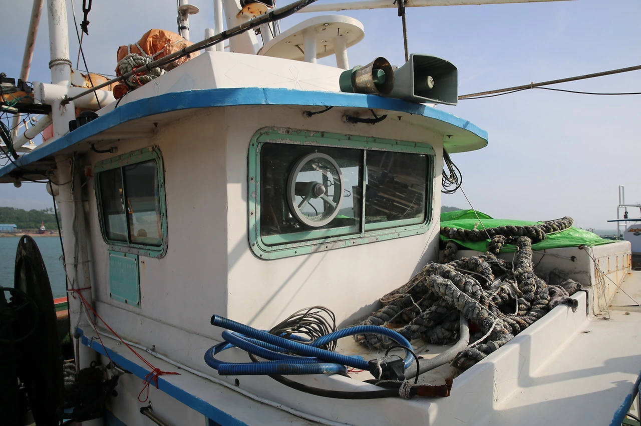 출조를 나가기 위해 대기하고 있는 배들이 묶여서 회변항에 정박해 있다.