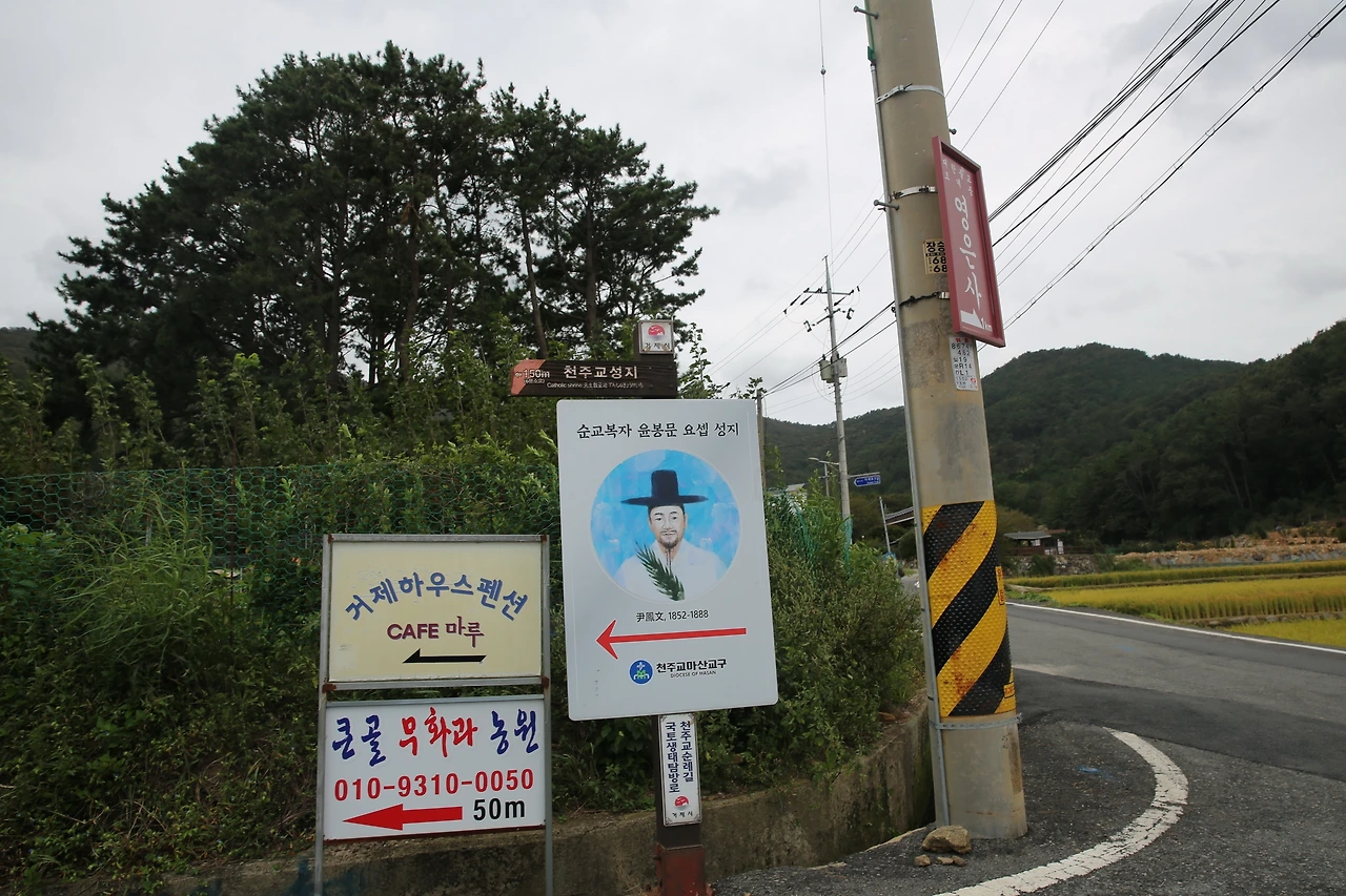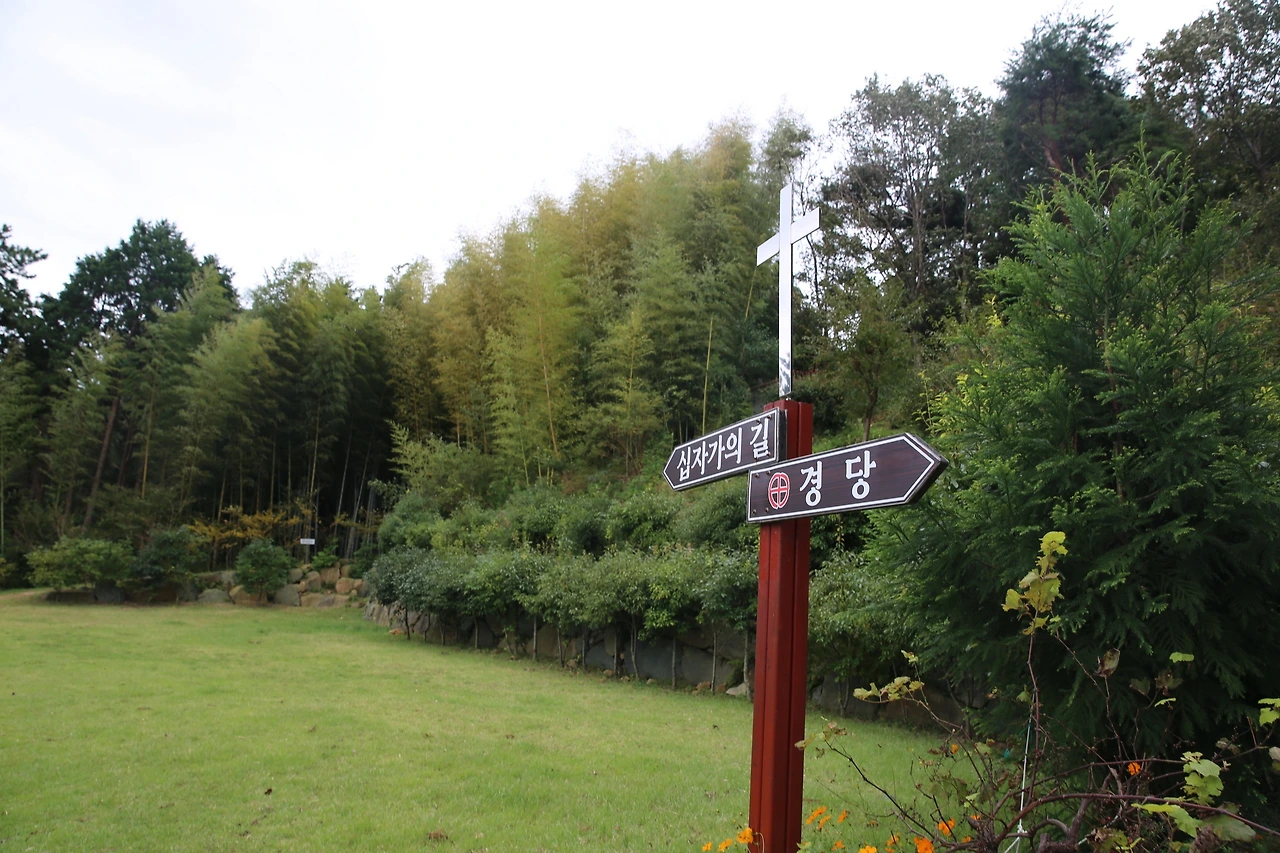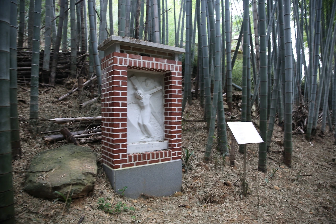 십자가 길은 대숲이 이룬 높은 벽의 터널과도 같았는데 깊고 어두운 숲은 비현실적인 풍경을 만들어내고 있었다. 바람이 잠시 불 때는 대나무가 그 소리를 전달해주면서 샛바람이 들리는 것만 같았다. 늘 푸른 대숲과 편백 숲 사이로 난 길은 종교를 떠나서 묵상하면서 걷기 좋았던 윤봉문 요셉 성지의 길을 걸으면 이탈리아 카라 지방의 대리석을 깎아 예수의 일생을 조각한 부조 14개가 울창한 대숲과 편백 숲 속을 만날 수 있다.