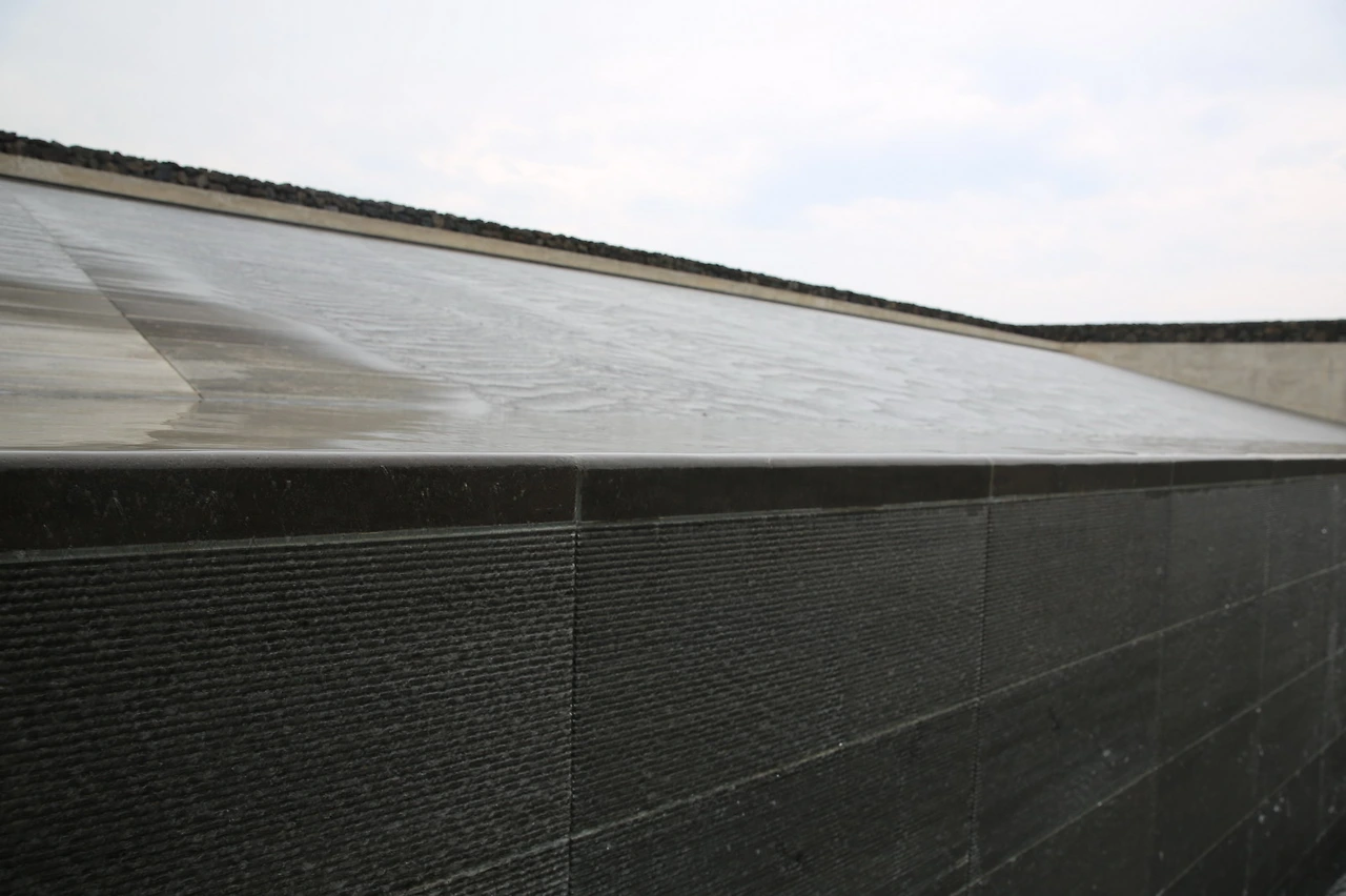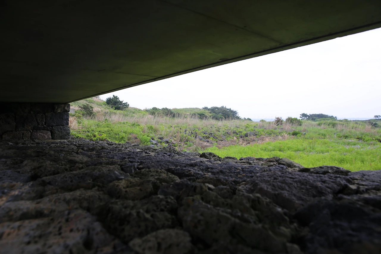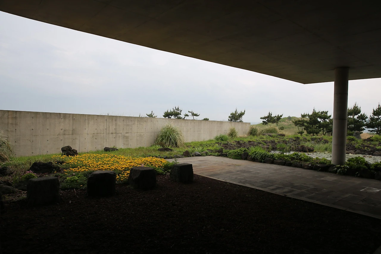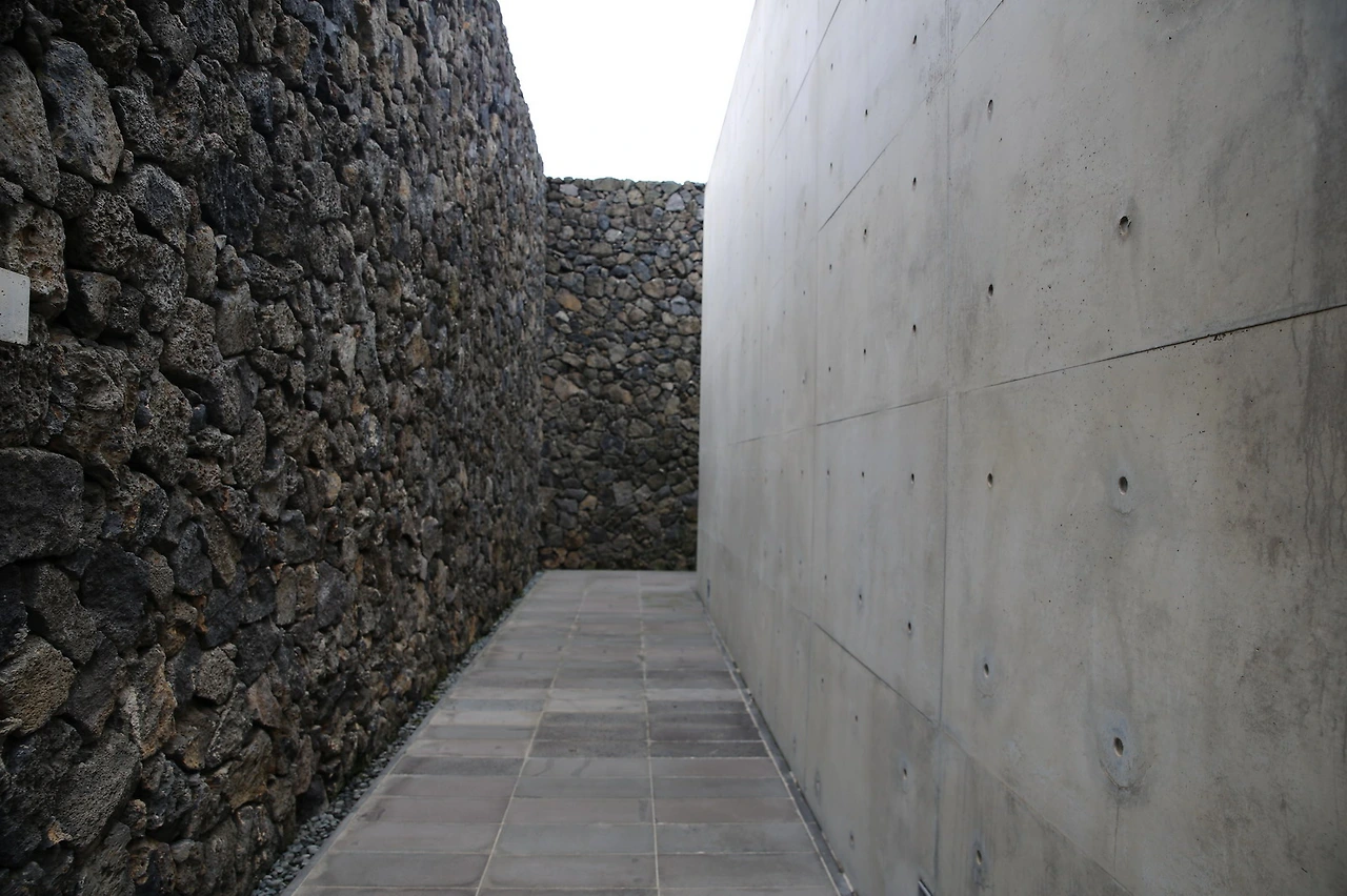 왼쪽은 제주도에서 가장 많은 화산돌로 쌓아 올렸고 우측은 노출 콘크리트로 만들어져 있다. 두 벽 사이에 이질감이 느껴질 만도 하지만 그런 느낌은 없다. 스페인이 낳은 건축가 가우디의 매력은 그만의 경험과 체험을 집적하여 만든 자유곡선의 공간이라면 안도 타다오는 직선의 공간이 매력이다. 두 사람의 건축 스타일이 다른 것처럼 보이지만 둘 다 부지의 형상이나 지역적 특수성, 기후 등을 고려해서 각각의 장소에 걸맞은 건축물을 창조했다는 데에는 공통점이 있다.