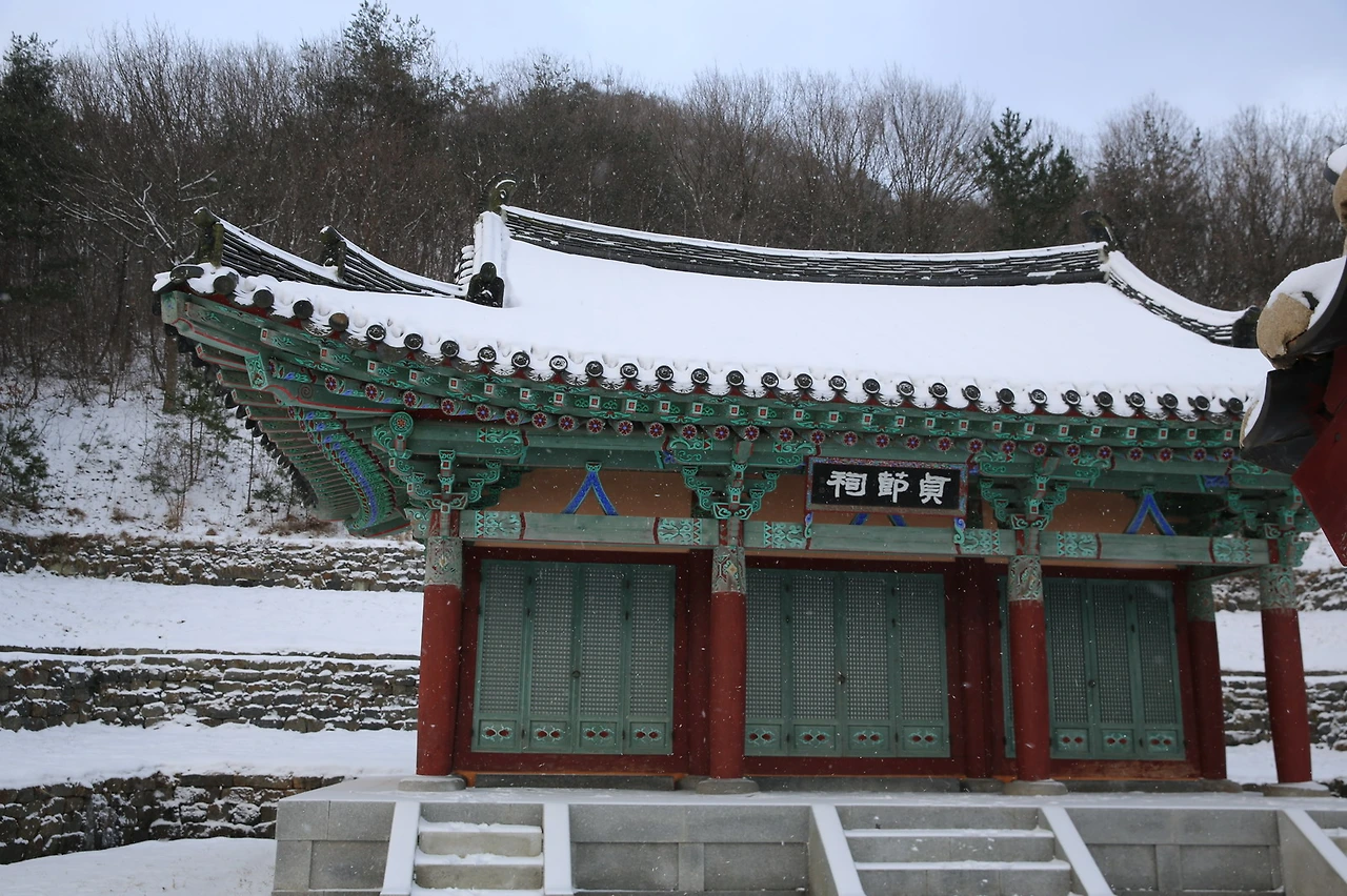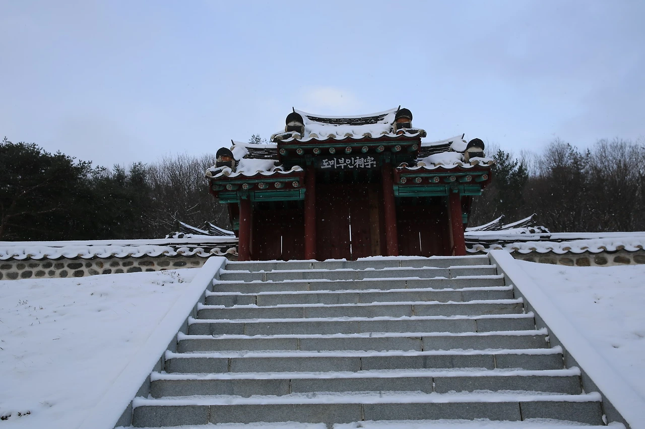 수진 : 응 저곳이 도미부인 정절사야. 눈도 안녹아서 미끄럽네. 애들아 조심해