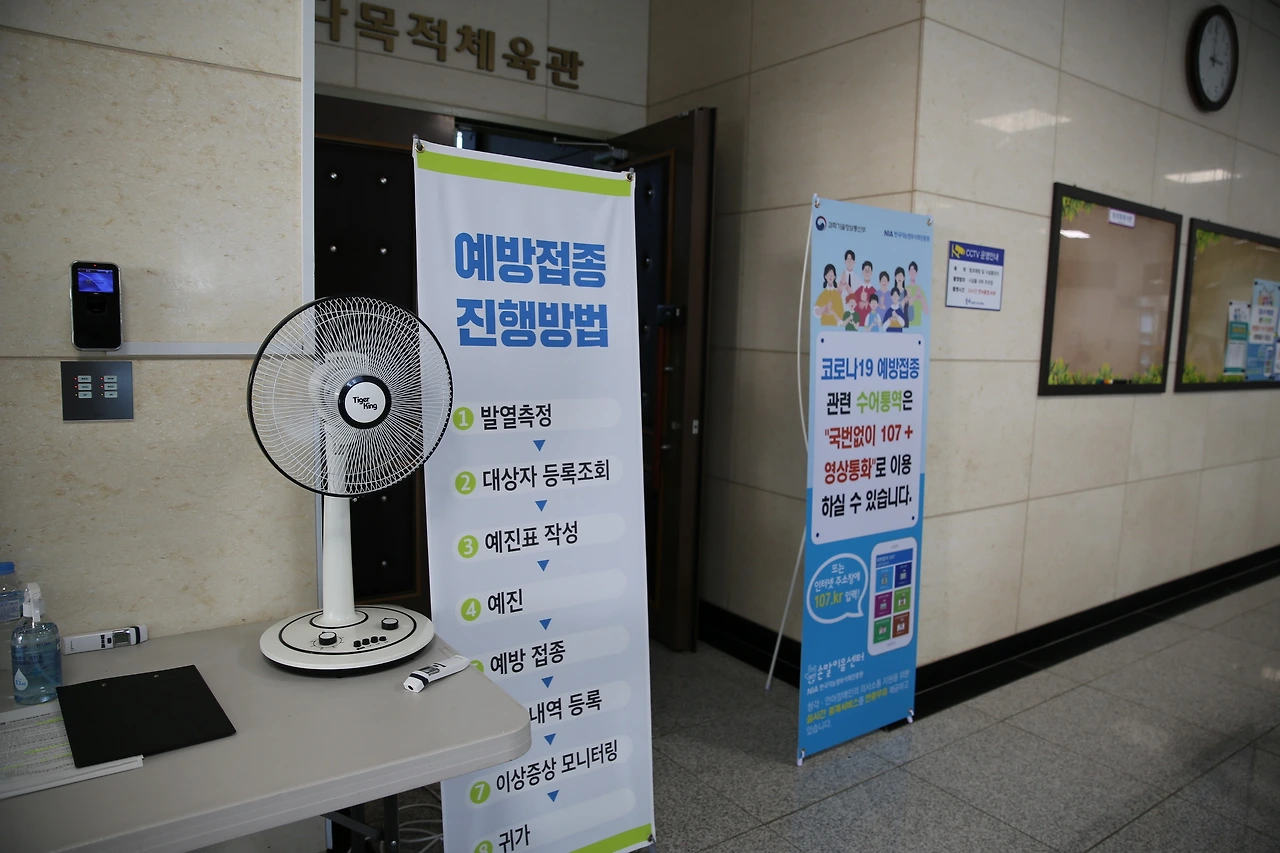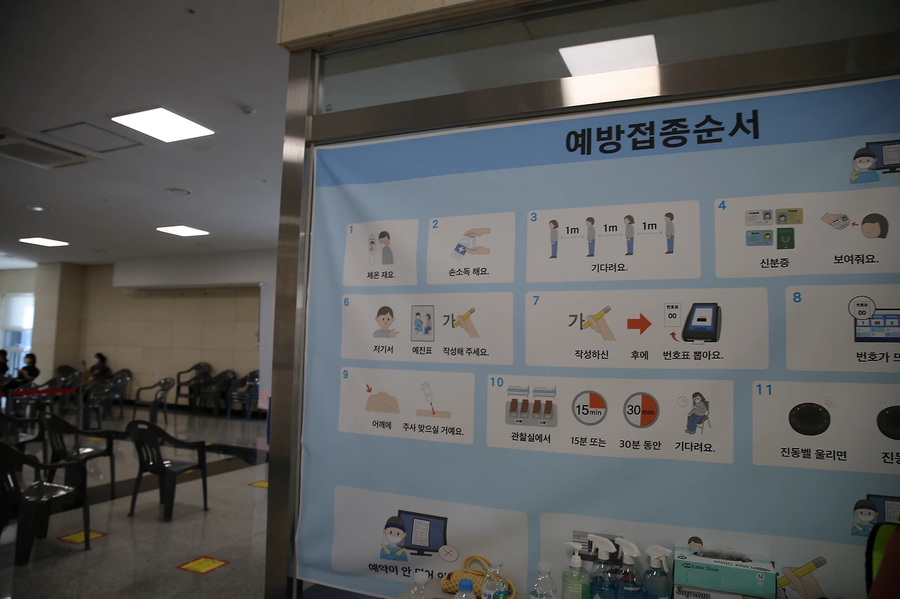 백신 접종을 위해 이곳에 오면 봉사자가 부를 때까지 대기하며 된다. 이곳에서 서류 접수와 상담을 받는다. 컨디션은 괜찮은지, 알레르기가 있는지, 먹는 약은 있는지 물었다. 기다리는 중에도 조끼를 입은 봉사자들이 돌아다니며 예진표 작성에 관한 것들을 도와주는데 그 후에 백신 접종이 이루어진다.