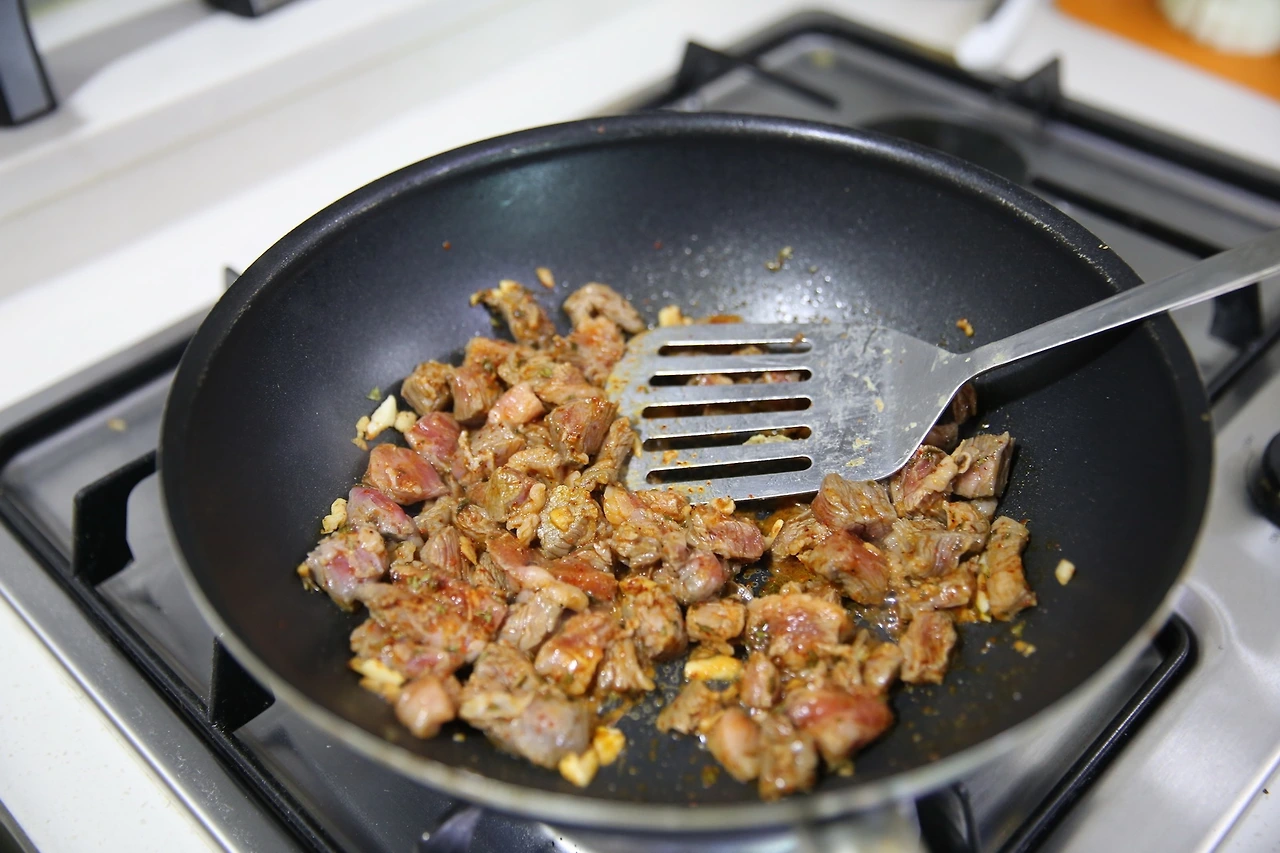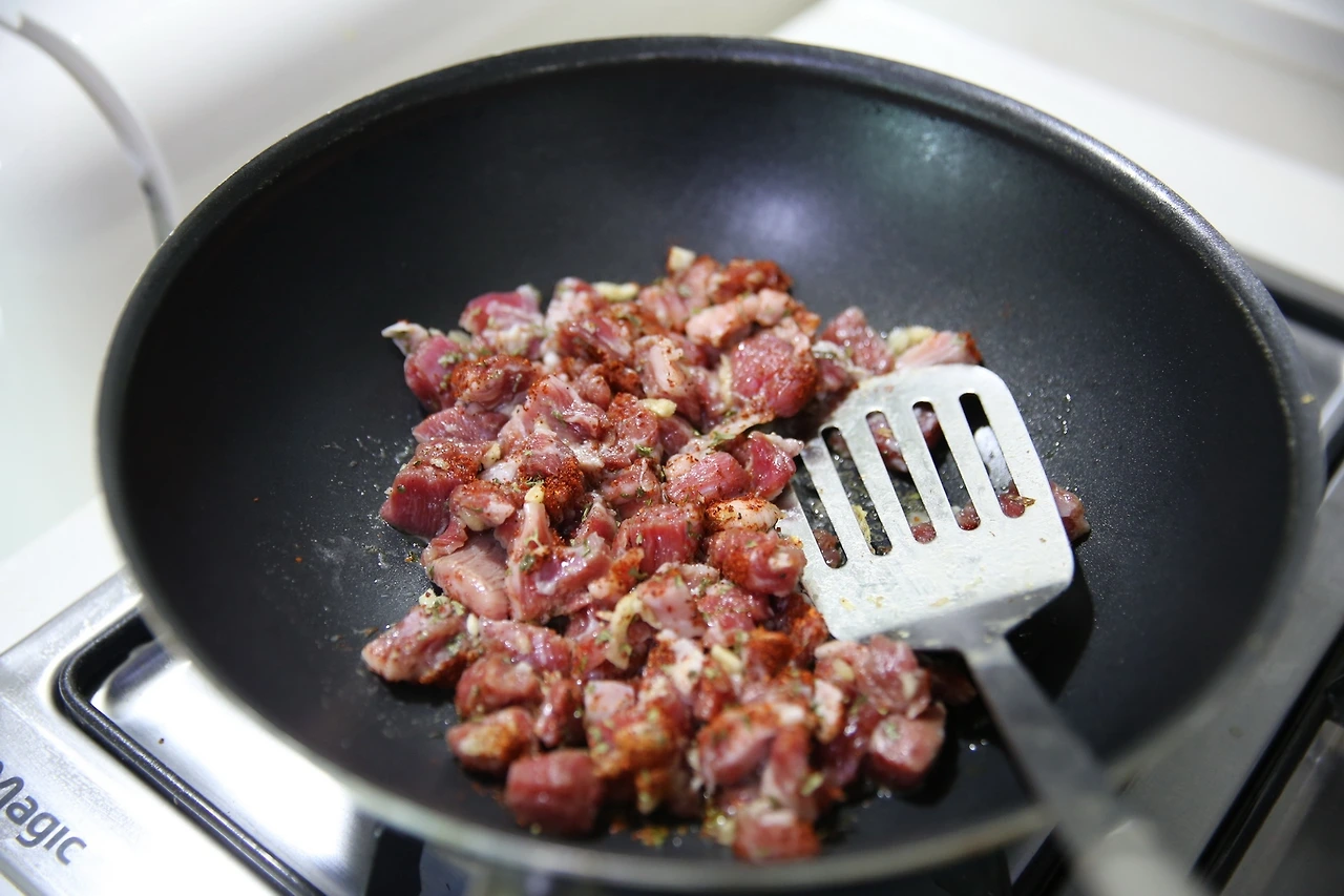 소고기가 가장 늦게 익으니 먼저 볶아주기 시작한다. 전기로 된 것도 있지만 볶음요리는 불에 복아야 할 것 같은 느낌은 뭘까.
