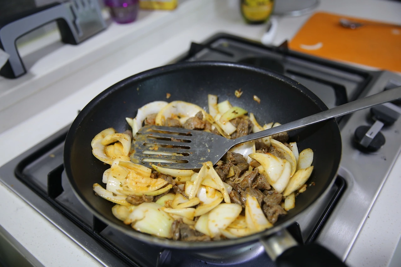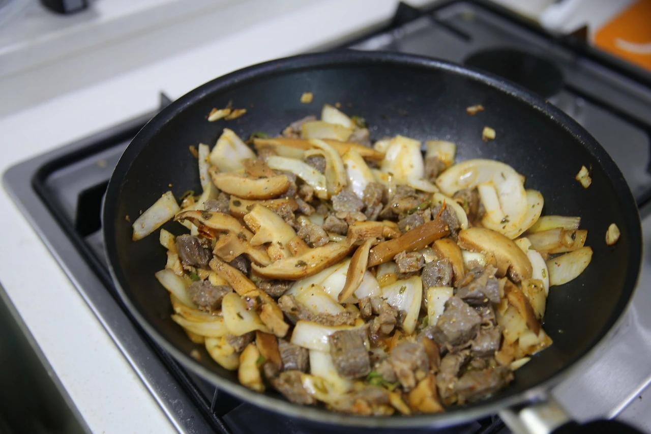 고기가 어느 정도 익으면 양파를 같이 넣고 볶아주기 시작한다. 양파의 숨이 죽을 때까지 볶아주다가 표고버섯을 넣어주었다.