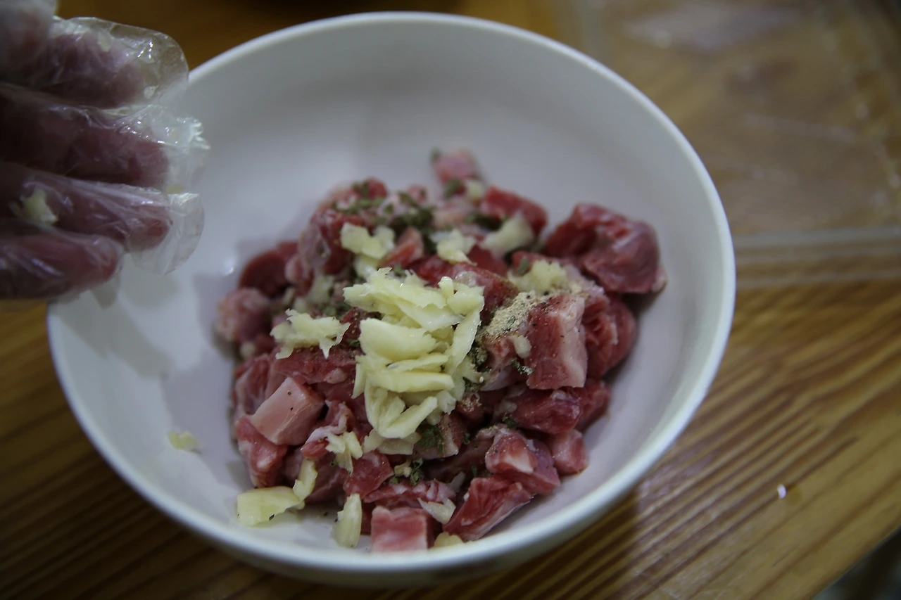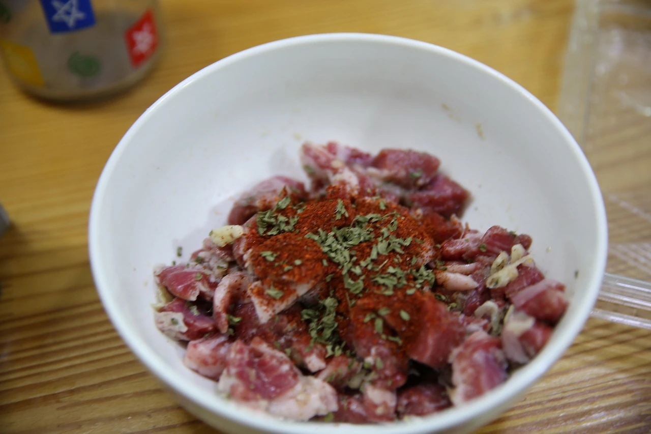 여러 향신료 등을 넣고 버물버물 해주며 소고기의 밑간을 해본다.