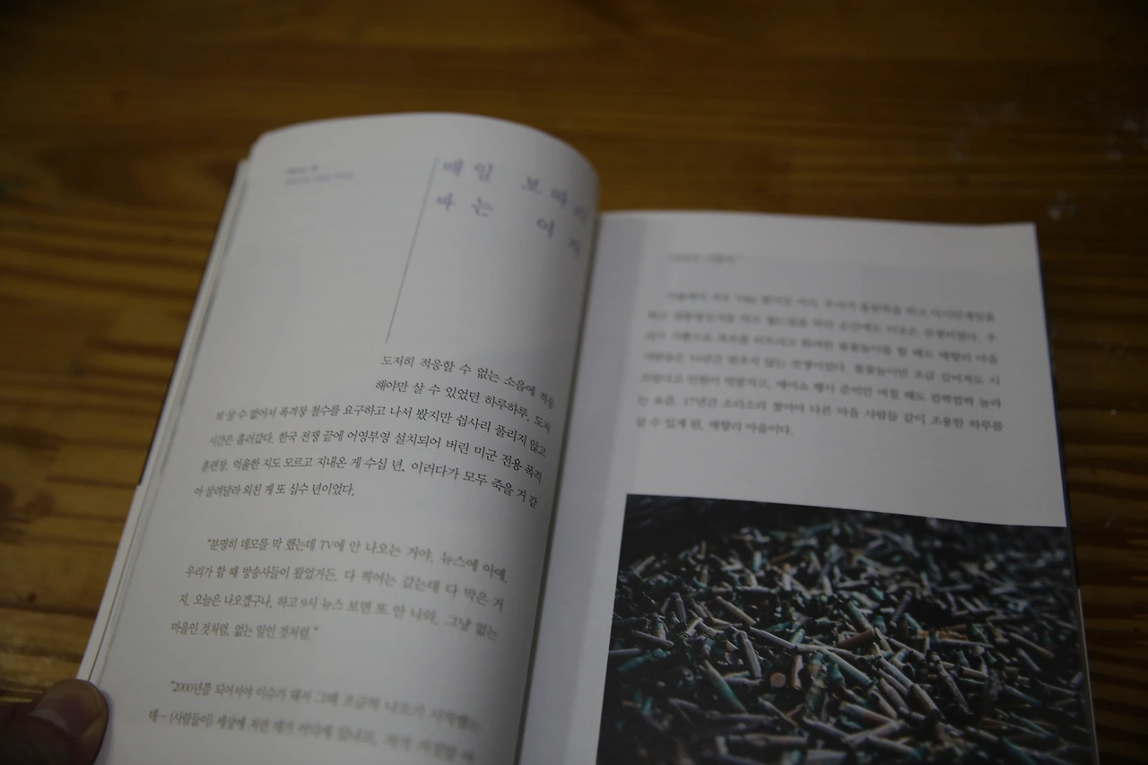 화성시의 매향리라는 곳은 여러 번 가본 적이 있는데 경기도의 신도시로 조성되고 있는 곳과 달리 전혀 다른 모습을 볼 수 있다. 폭탄이 떨어졌던 곳이나 사용되었던 다양한 크기의 폭탄들이 그곳에 있었다. 화성시의 매향리의 봄이라는 책을 읽어본다.