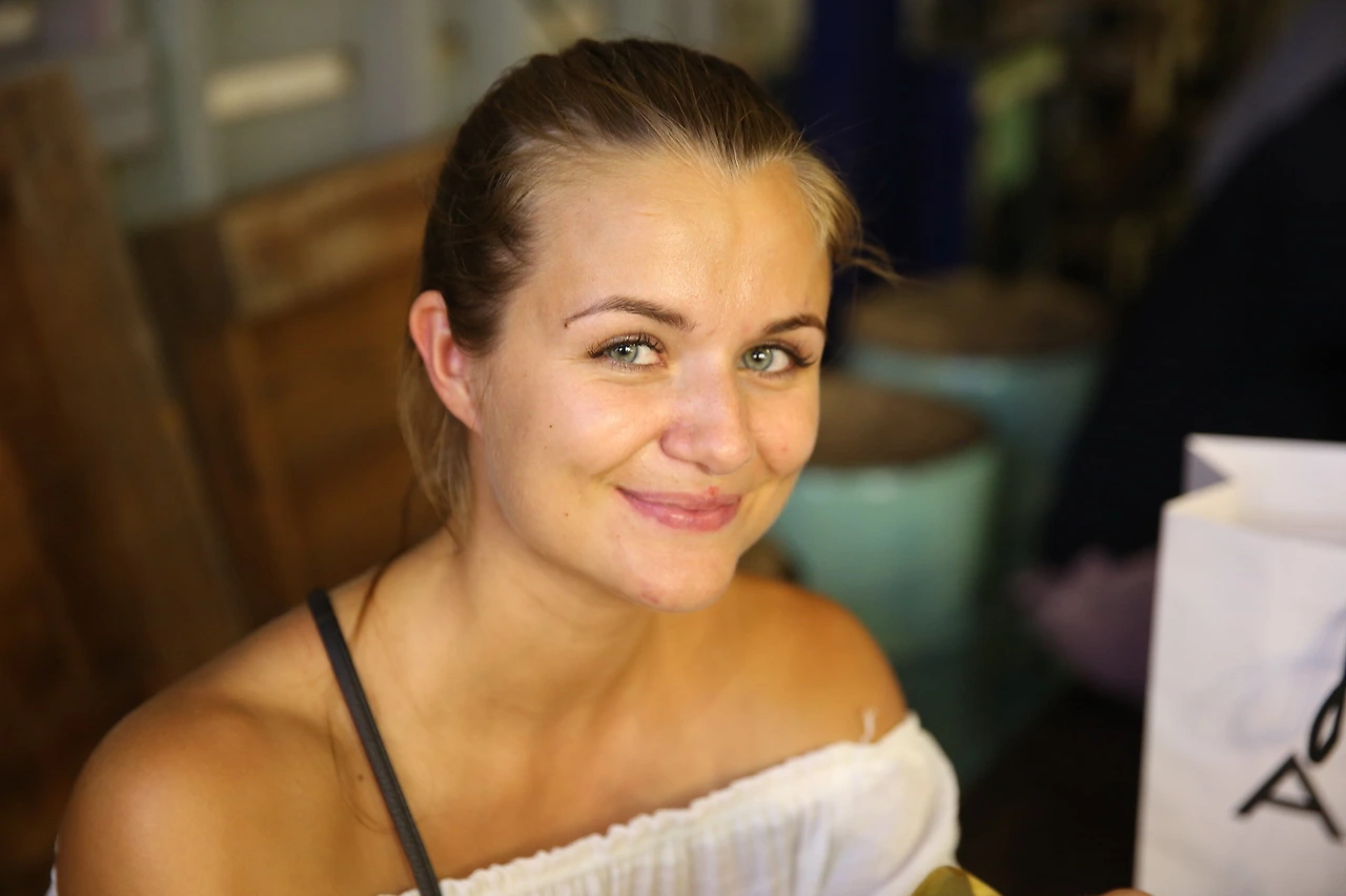 가게에서 일하고 있는 그녀는 시원시원한 의상을 입고 있다. 남자 친구가 사주었다는 2캐럿짜리 다이아몬드 반지를 끼고 있는 그녀는 미소가 이쁘다.