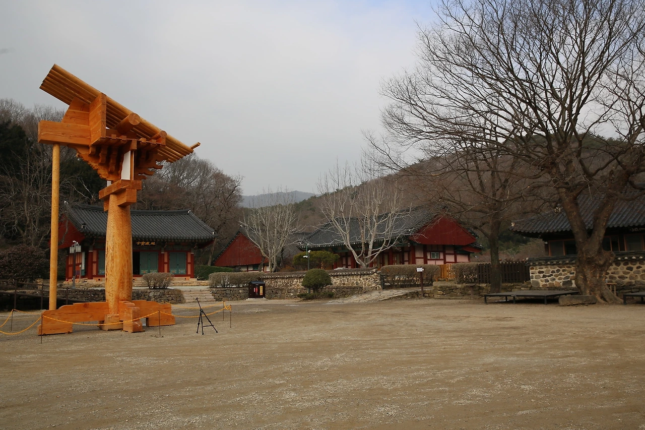 사찰의 경내에는 기둥이 하나 덩그러니 서 있어서 유심히 살펴보았다. 배흘림기둥을 세우고 그 위에 공포를 얹었으며 지붕구조를 연목으로 마감한 선운사 기둥의 면면을 실제 크기로 감상할 수 있는 이 전시물은 폭이 4.5 m×4.5m에 이르고 높이가 무려 9m에 이른다.