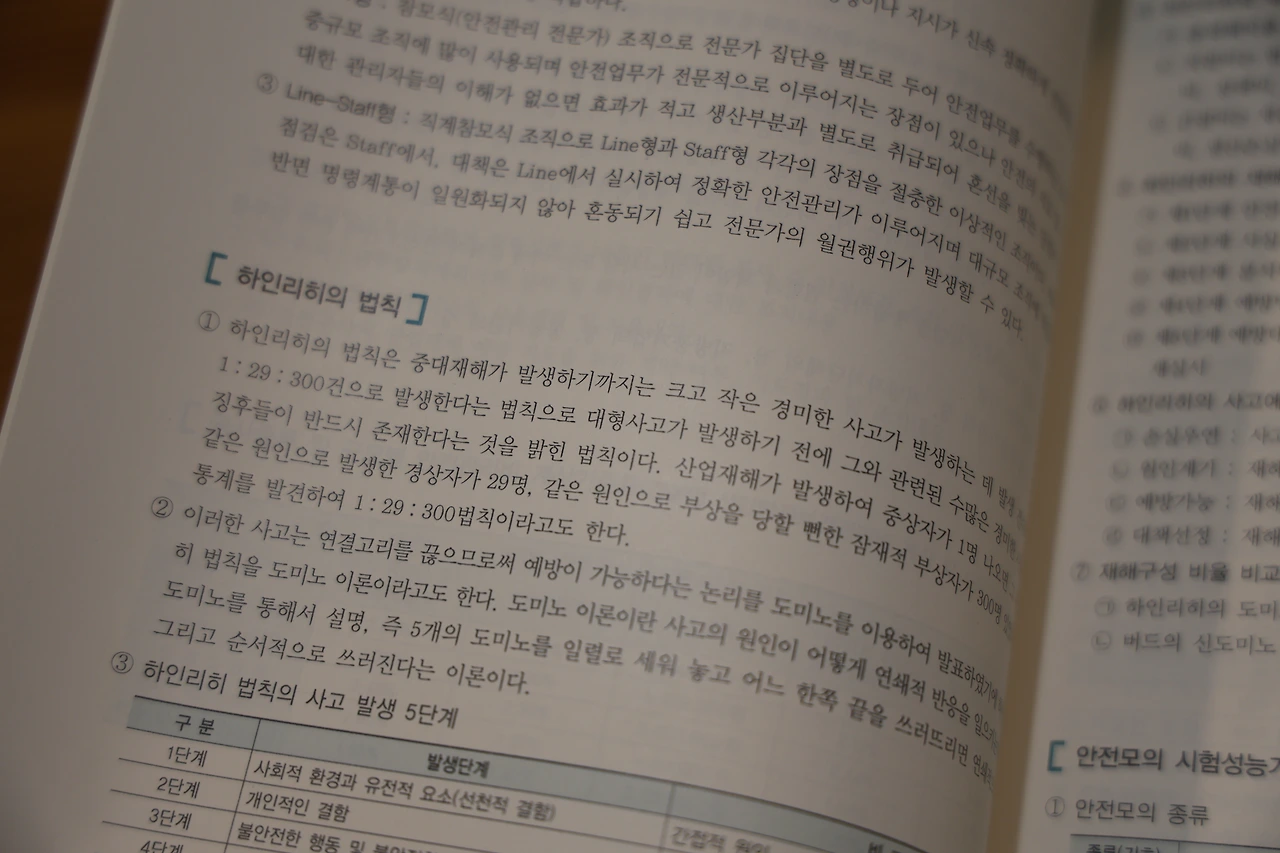하인리히의 법칙과 같이 일반상식에 준하는 그런 내용들도 이 책에서는 다루어지고 있다. 산업안전이라고 되어 있지만 사실 일하는 것은 우리의 삶과 너무나 면밀하게 연관이 되어 있다.