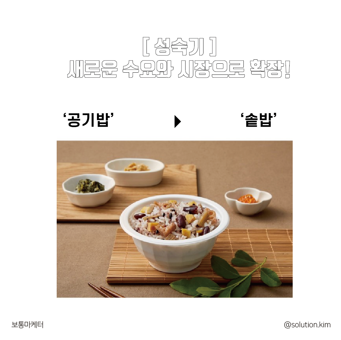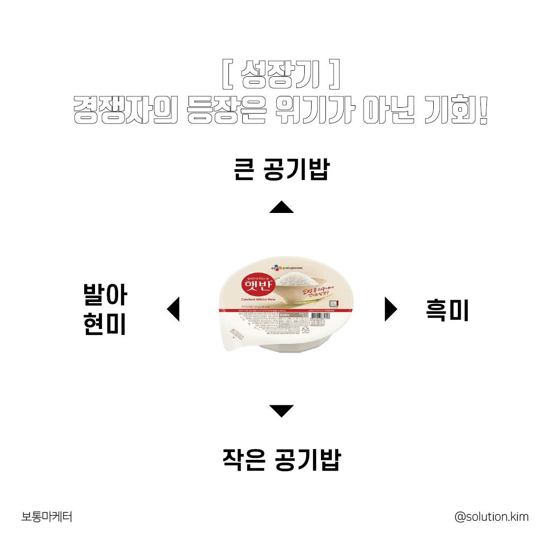 햇반이 즉석밥 시장을 만들면서 경쟁자가 등장하기 시작합니다. 이때부터 본격적인 시장 성장기가 시작되는데요. 이때 기존 브랜드는 방어와 공격을 번갈아 가며 공고히 시장 위치를 만들어 나가야 합니다. 햇반은 오뚜기 등 경쟁업체가 등장하자 기존 상품인 흰쌀밥은 사이즈 다변화(작은 공기밥, 큰 공기밥)를 통해 방어를 하고 발아현미, 흑미 등 신규 상품을 출시해 역공격을 했죠.